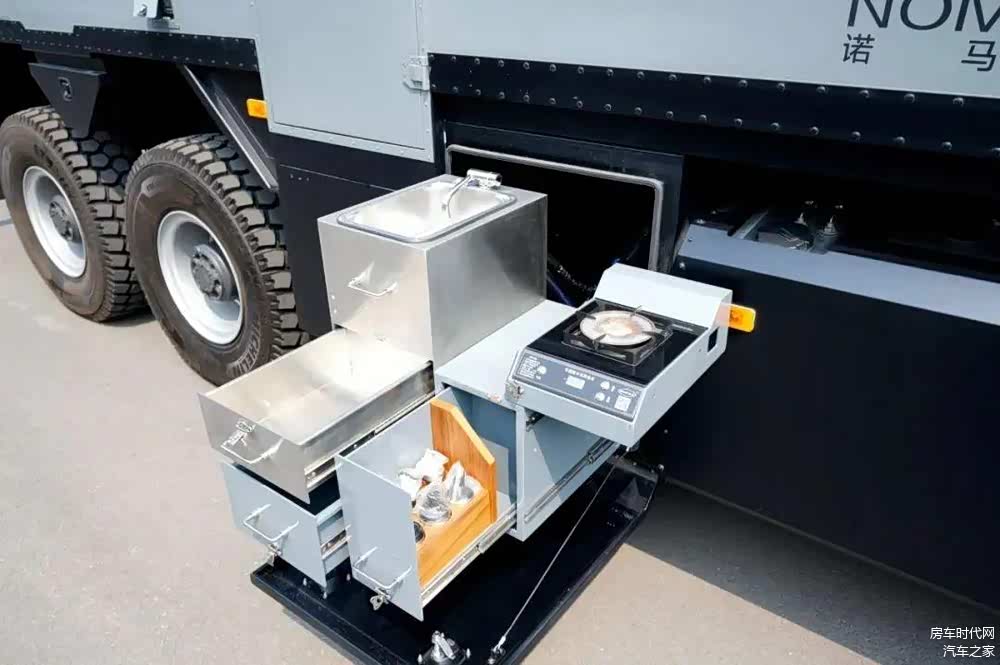 “征途者V”双排型还配备了丰富的户外露营设施。车辆自带一个室外厨房以及可伸缩的意大利品牌遮阳棚,为乘员提供了丰富的户外旅居体验。