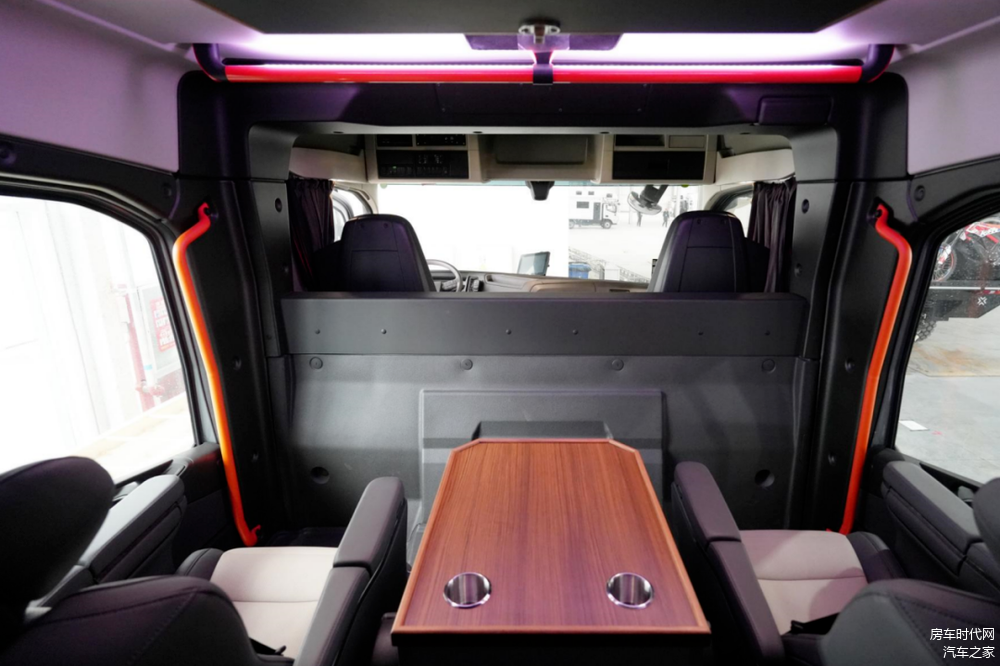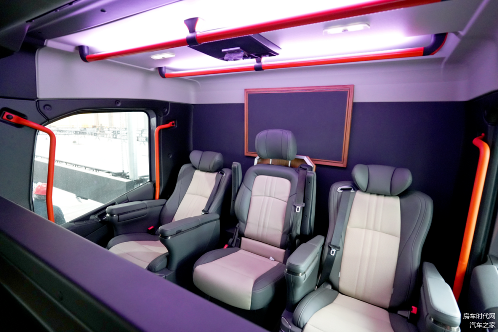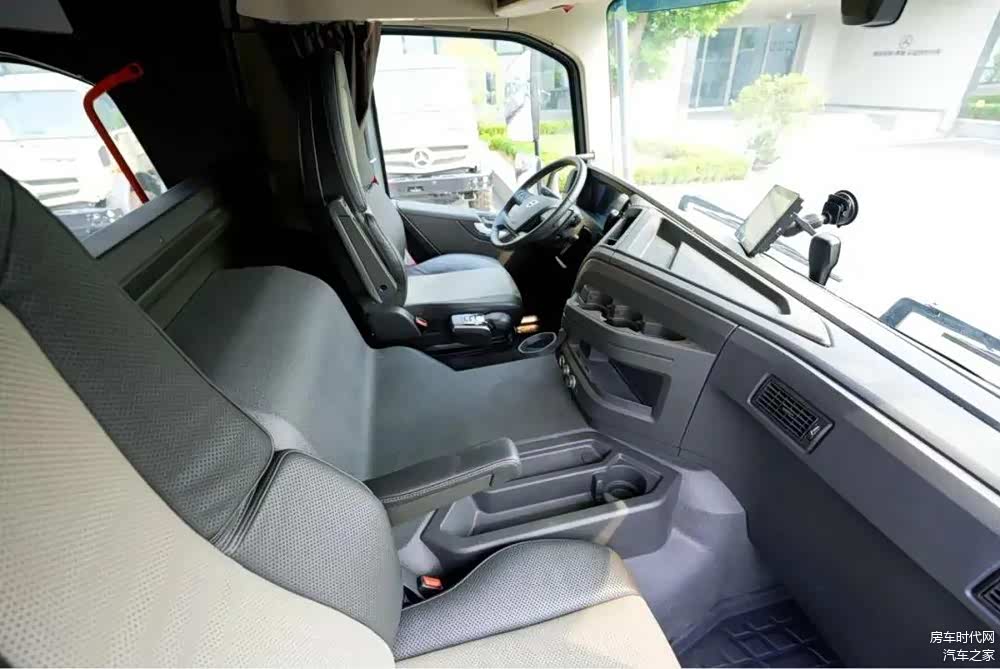驾驶室延续了以往的北欧风格,简约实用不失科技感,与众不同的双排设计细节上也值得考究,先看前排,主副驾驶位置配置了打孔皮革的空气悬挂座椅,座椅提供了多种功能选项,便于乘员调节,以适应长途旅居的需求。