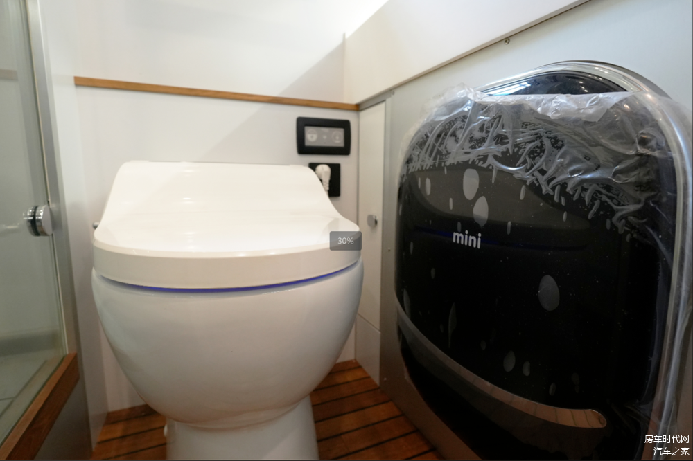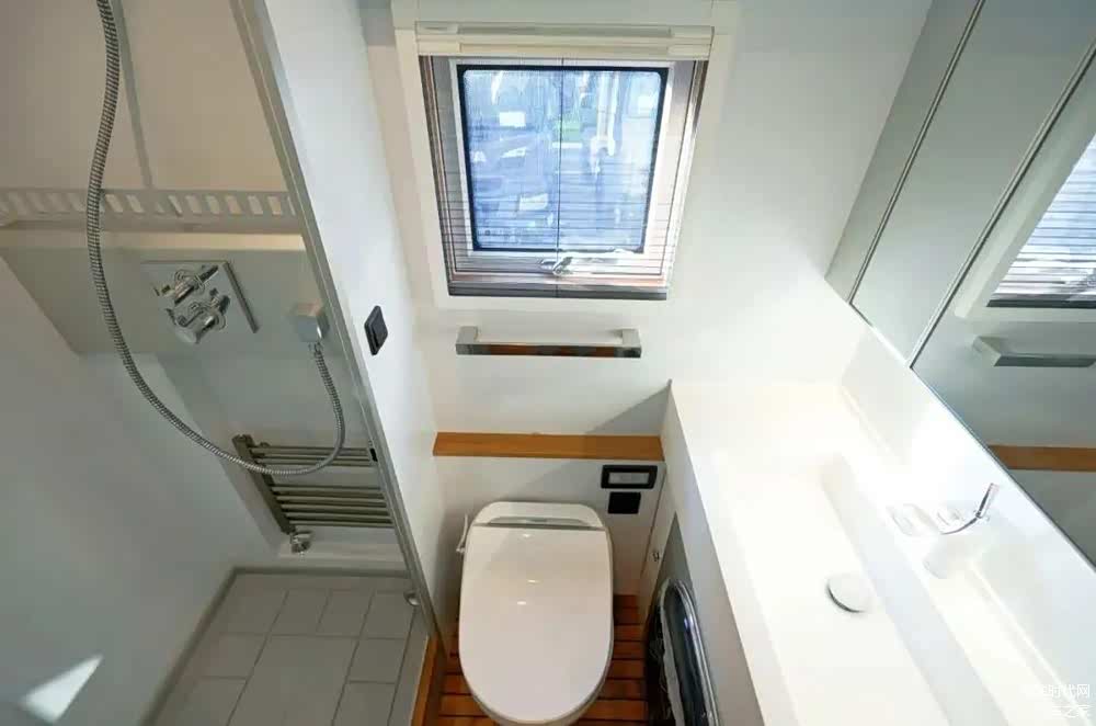 卫浴间为干湿分离式设计,干区配置有一体式洗漱台、镜柜、荷兰智能马桶以及双向通风换气扇(可遥控带有雨水感应),台面下方还配备了一台带烘干功能的MINI滚筒洗衣机,洗涤和烘干一体化的设计节约空间的同时,为用户旅居带来极大便利。