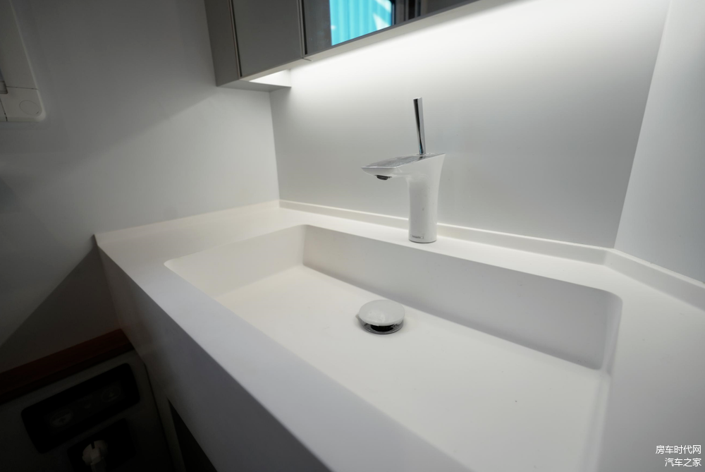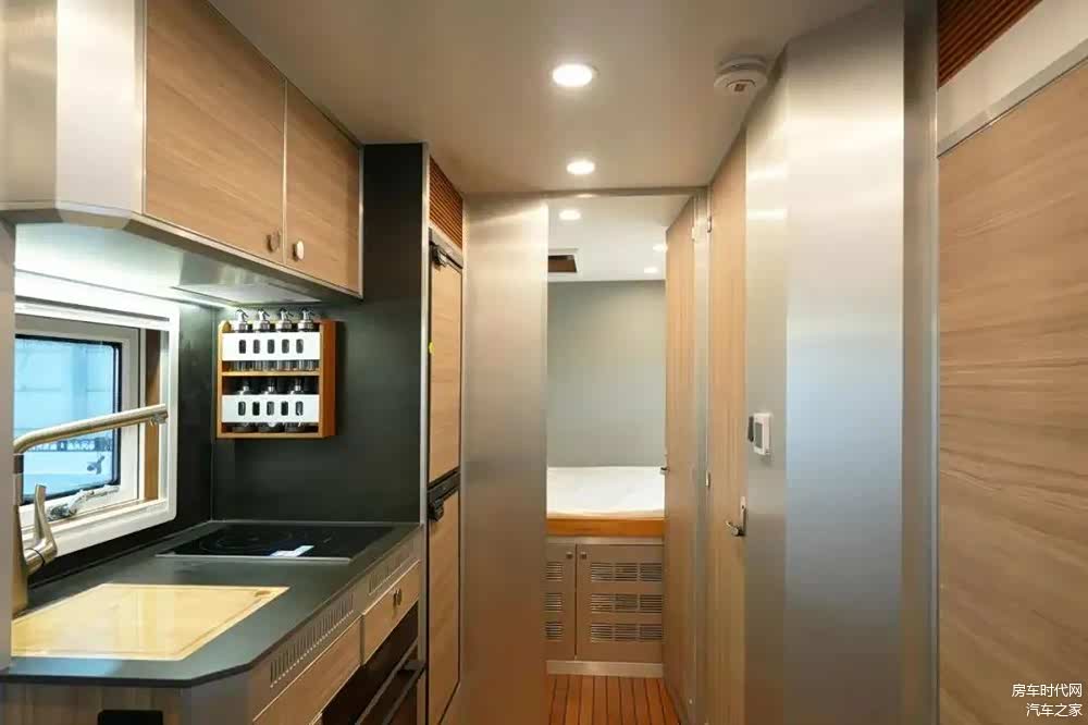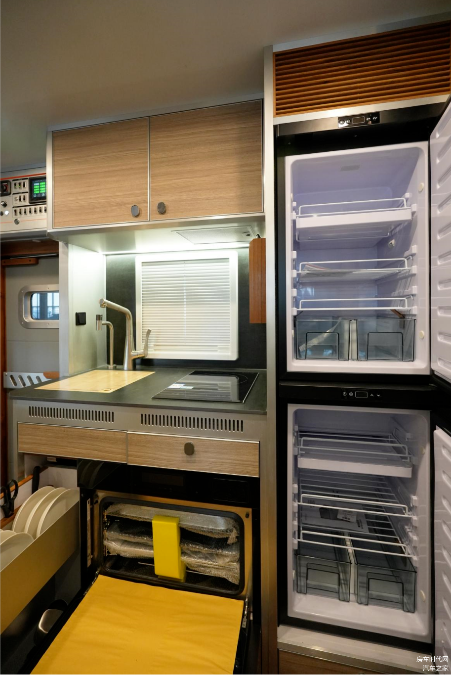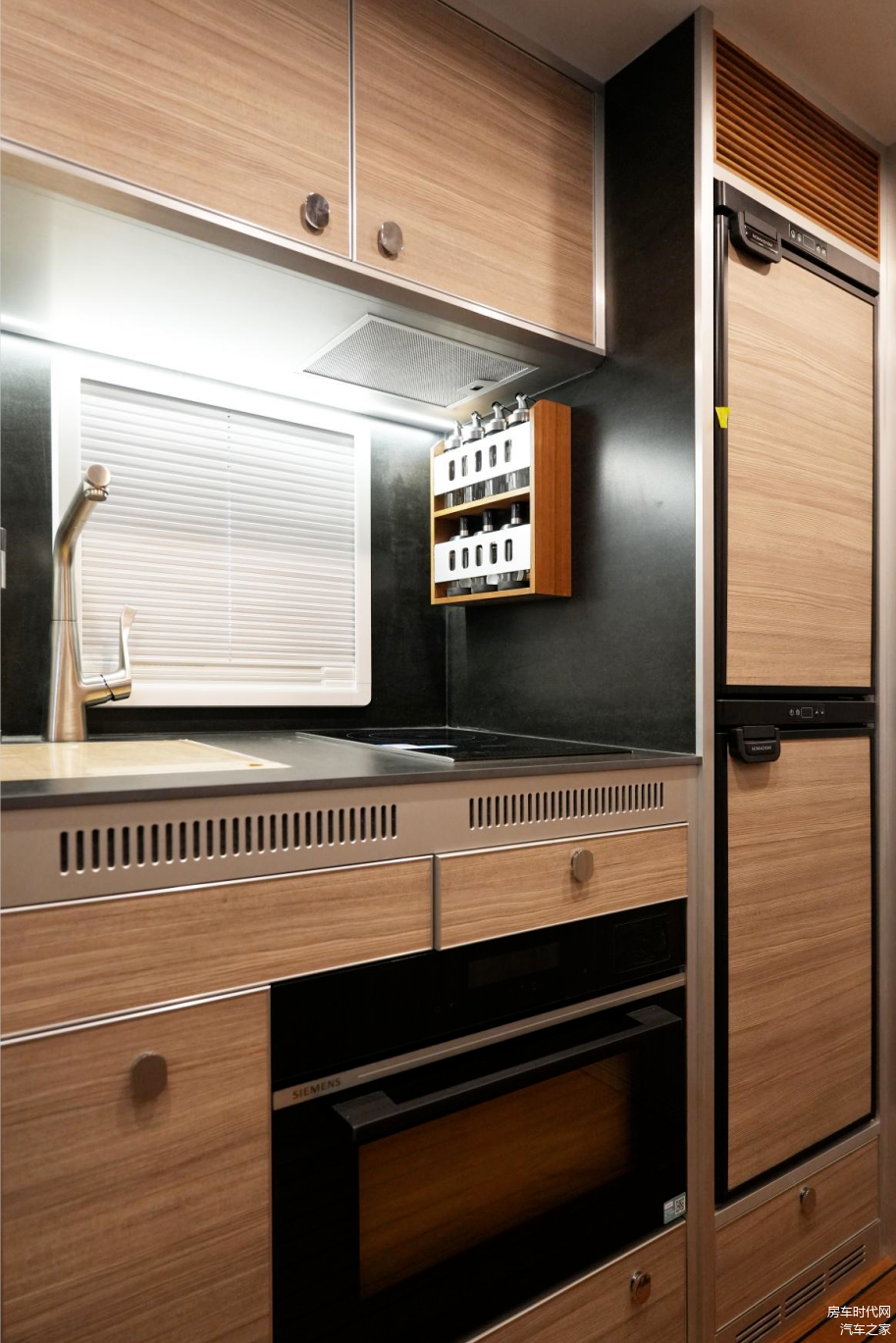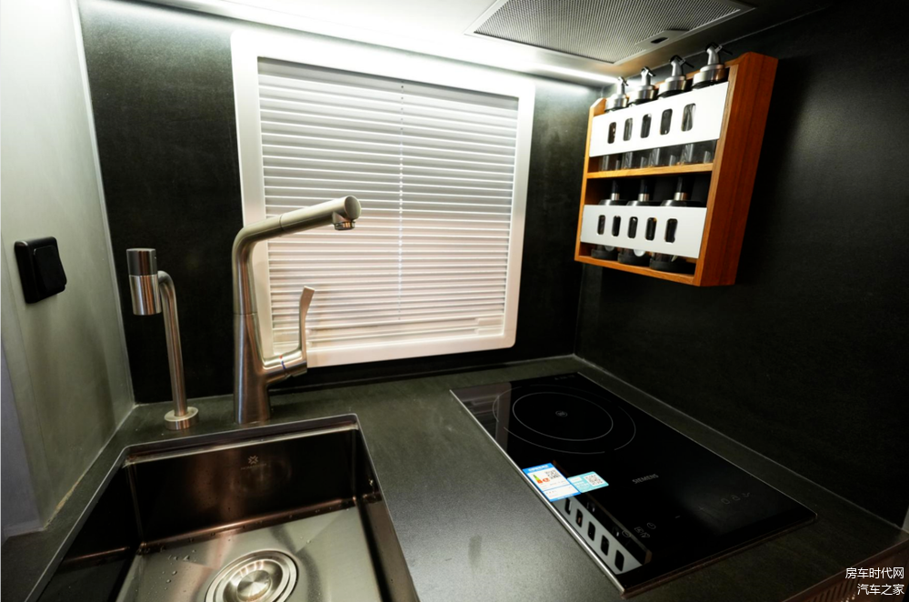 厨房设在车辆中部,深色岩板搭配原木色橱柜、吊柜,整体充满轻奢质感,区域内标配了不锈钢水槽+水龙头、壁挂式调料篮、西门子2100W单灶电磁炉、内置抽油烟机、152L分体式冰箱等厨房功能设施。