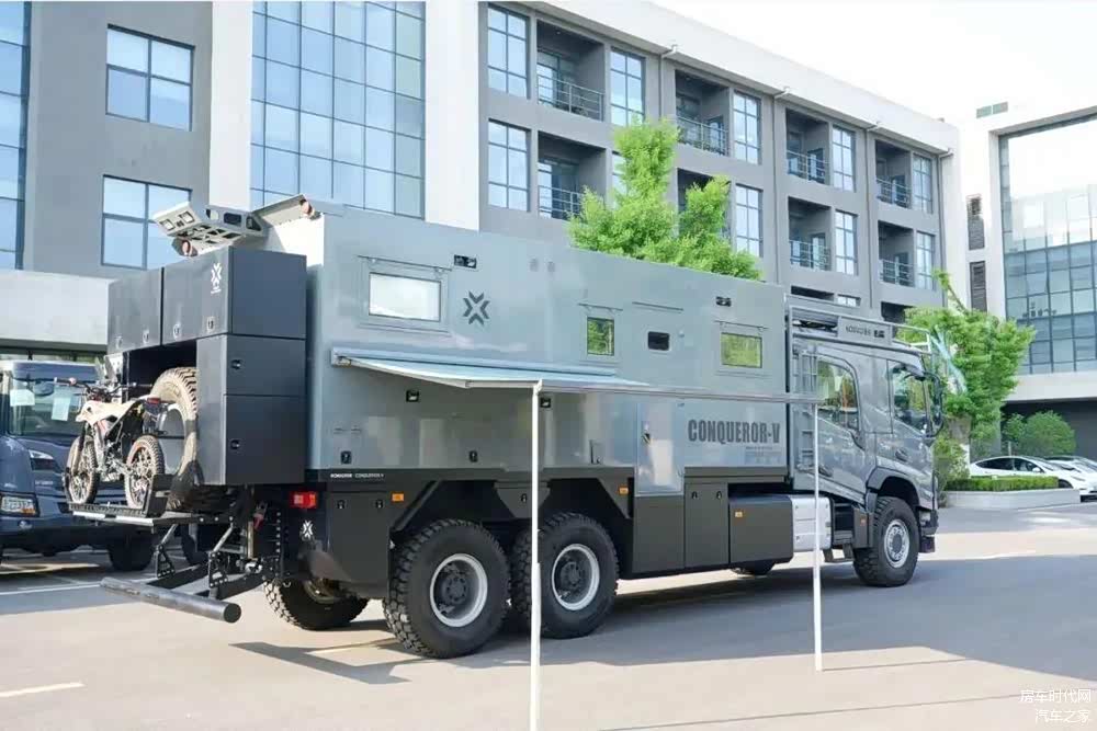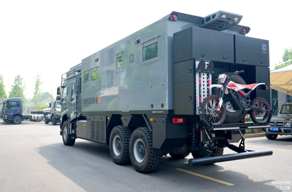 车尾装备了一个18500磅24V电动绞盘以及一个可以挂载越野摩托车的升降架,为用户提供了丰富的野外短途探险选择。旅居时,乘员可以通过高清倒车影像以及八路安防监控摄像头实时观察车周情况,为出行提供安全保障。此外,车辆尾部还提供了储物箱选配项目,可以进一步提升车辆的储物空间。