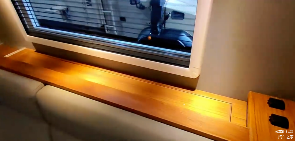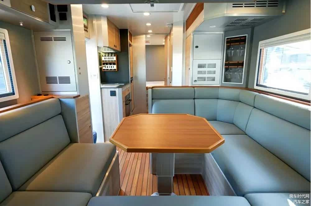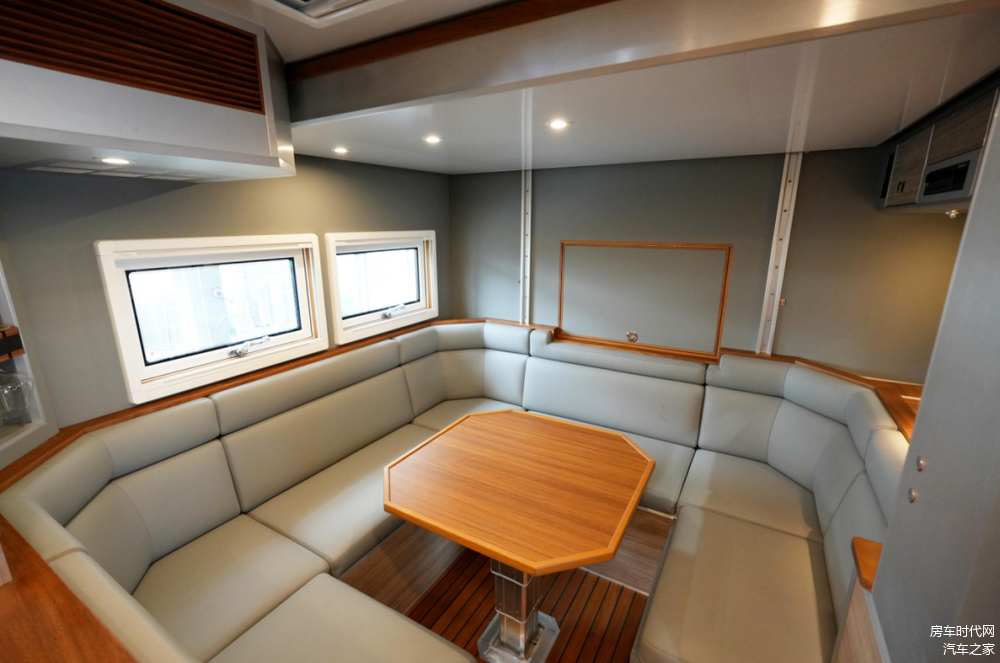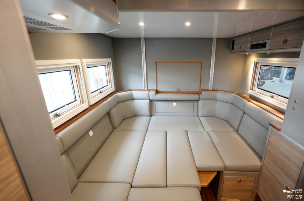 会客区空间非常大,占据了后厢近1/3的空间,环形沙发+电动升降柚木桌设计能够容纳一家人使用,即便是聚餐也不必担心座位不够。会客区两侧设计了多扇窗口,为区域提供了充足的采光和通风条件。此外,在沙发的一侧还特别设计了一个红酒杯储藏柜,方便在用餐时享用美酒。