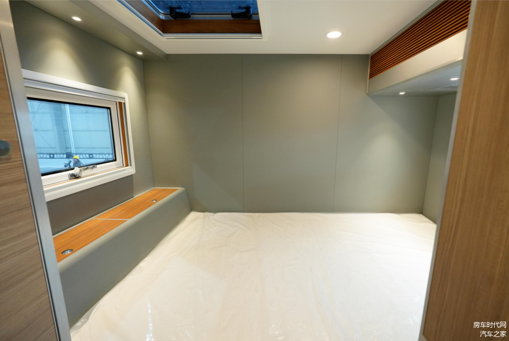 车尾固定睡卧区采用了带门独立大床房的设计,整体占据了车厢1/3的空间,内置一张1390×2015mm的双人大床,标配有乳胶床垫,内部还设有储物柜、空调、通风外推窗以及天窗,保障了用户舒适的睡眠体验,实用和美观兼具。