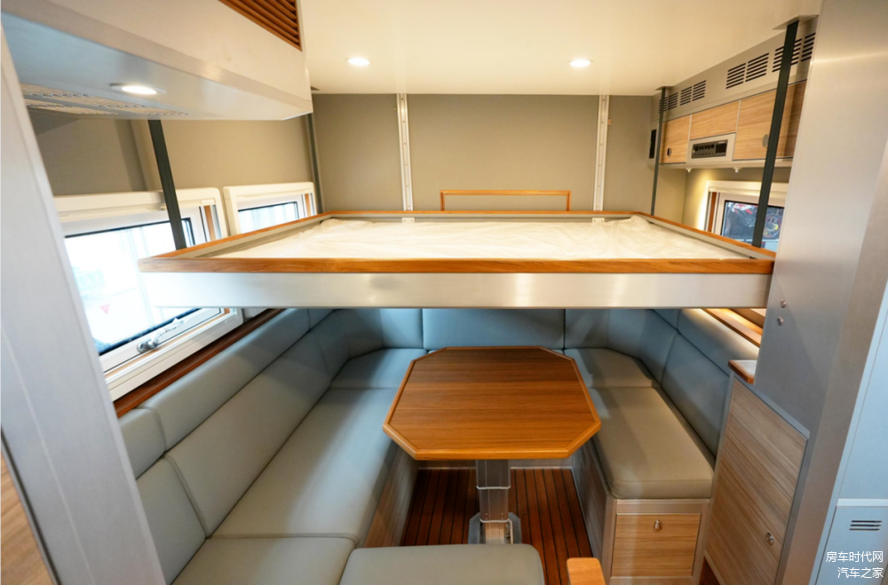 休息时,环形沙发可以与柚木桌拼成一张临时床铺使用,尺寸可达1465×1990mm。此外,会客区顶部还隐藏了一张1365×1995mm的电动升降床,整个区域能够容纳4人睡卧。