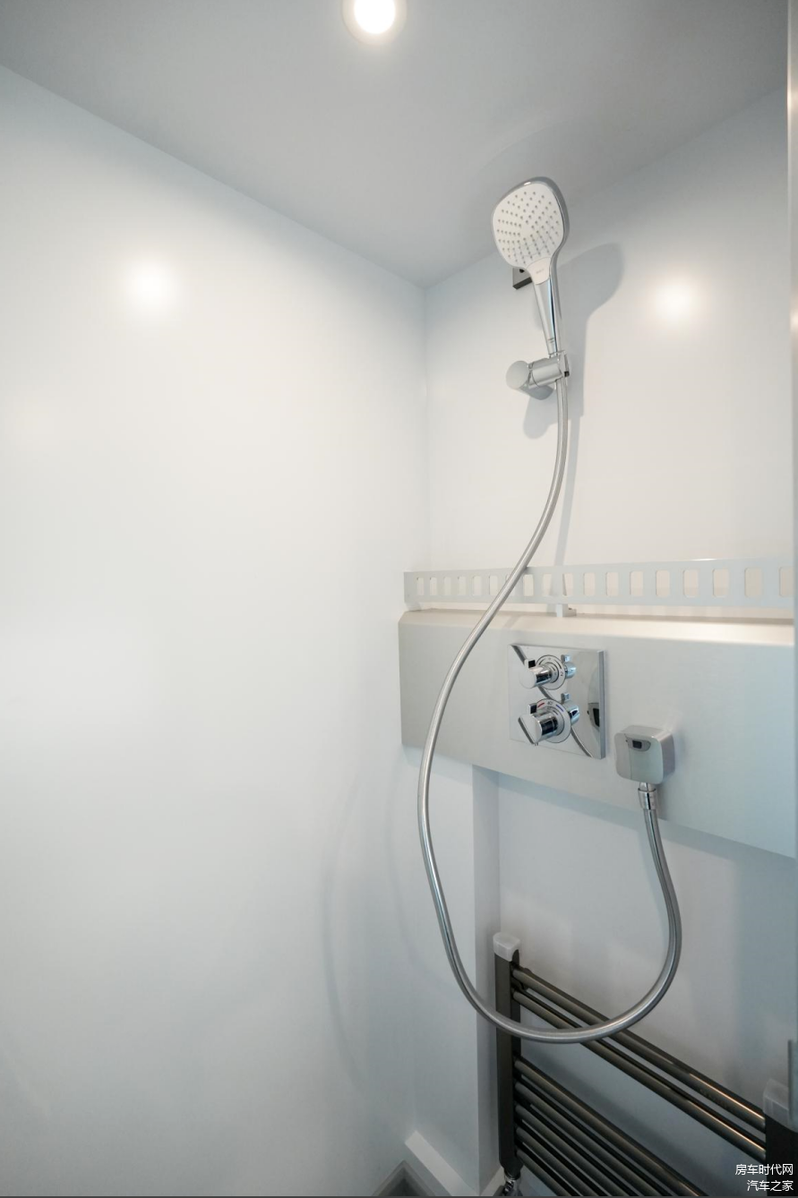 湿区也就是淋浴区配有一扇折叠玻璃门,作为干湿区域的分隔,底座为一体成型设计,防水的同时便于后期清洁,区域内标配有40L电热水器、汉斯格雅恒温混水器及花洒,此外内侧还安装了壁挂式暖气片,即使在冬季也可以温暖沐浴。