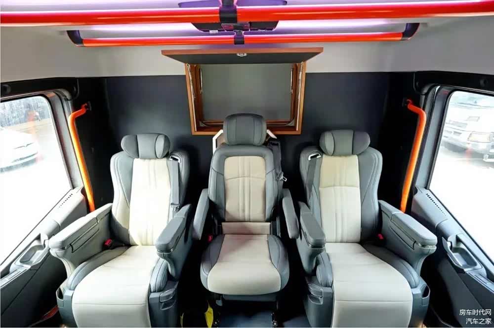 其中左右两边为独立航空座椅,中间为带扶手的可折叠座椅,折叠后可以当作临时桌面使用。驾驶舱与后方生活区之间设置了一个小隔断,内嵌交流窗口,形成半封闭的空间,增添了整体的商务气息。