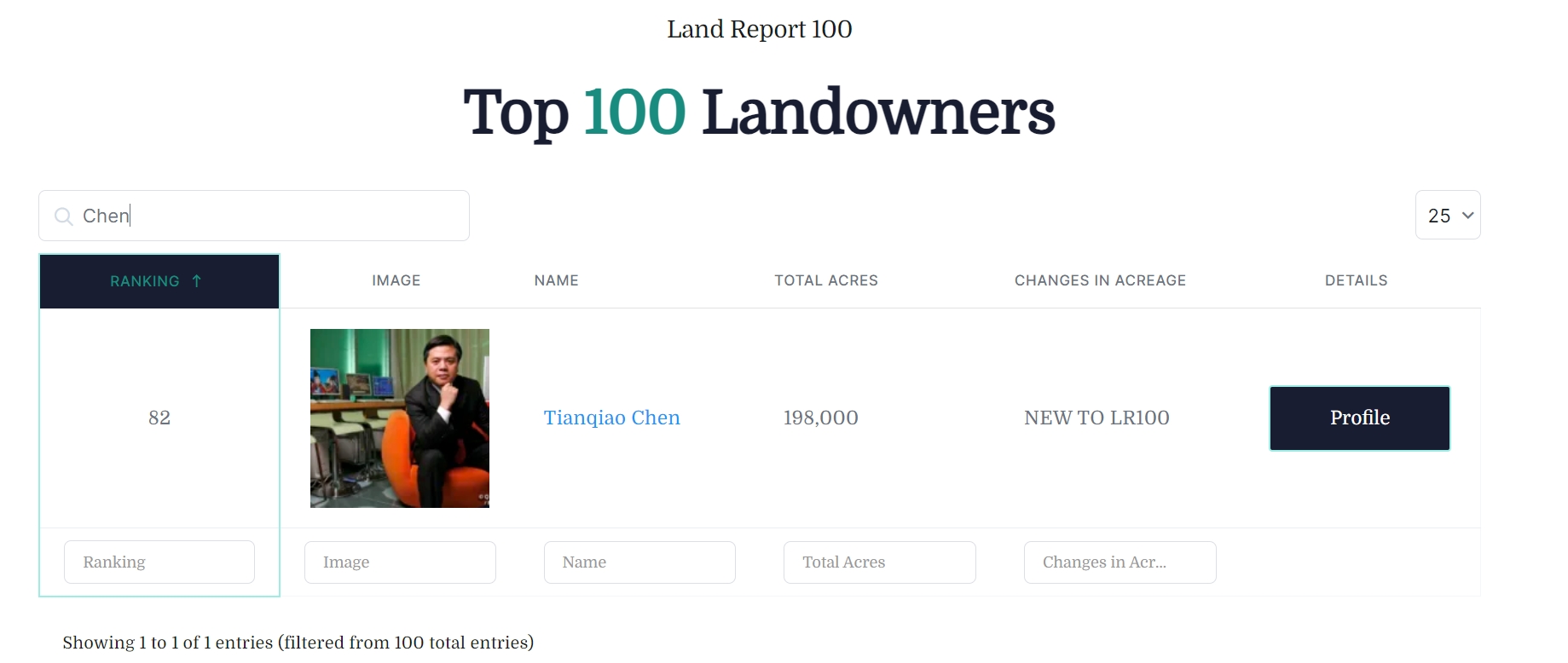 《土地报告》的数据显示,陈天桥在美国的俄勒冈州Timberland拥有19.8万英亩的土地,这也使他成为TOP100榜单上的第82位。这也使得他成为拥有美国土地第二多的非美国公民——仅次于排名第6的加拿大Irving家族。