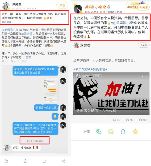 “深房哥,这两天在我的V+会员群里多次推荐了你的会员。我很喜欢你的文章。”2019年1月24日,“美妈陈小泉”第一次与“深房理”联系,并自我介绍:“我是个杂牌新博主,从育儿到两性到房产到金融到法律到心理学,乱写一通。同在深圳,望深房哥多指教”。