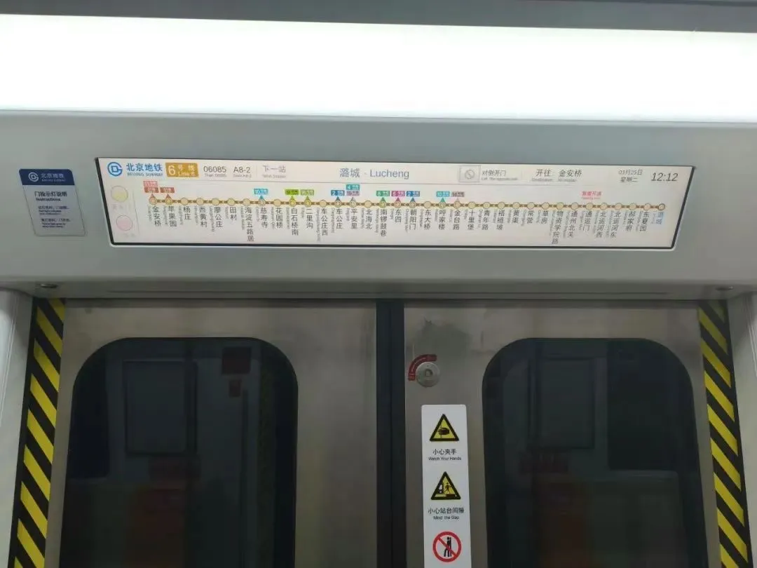 新列车的报站地图从传统样式升级为高清LCD动态地图。其屏幕采用高亮度、高对比度的显示技术,即使在光线强烈的车厢内,显示内容依然清晰可见。地图不仅能够直观展示所在位置、行车动态、开门方向等基础信息,还能够显示换乘线路的详细信息,方便乘客出行。