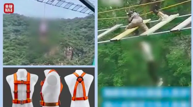 2022年7月22日,天津市蓟州区的九山顶景区,一名游客在“步步惊心”网红吊桥项目游玩时,突然昏迷,悬在半空。救援时,安全带突然脱落,游客摔下山谷,不幸身亡。同一天,湖北恩施地心谷景区,一名十岁男孩在同样的“步步惊心”网红桥项目上游玩时,不小心踩空,安全带脱离身体,摔下吊桥,腰椎、胸椎骨折。央视记者发现,前面两起安全事故中,他们穿戴的都是“三点式安全带”。