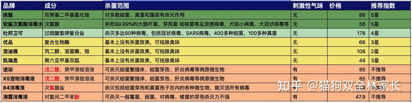 相信你也曾经遇到过这些问题: 作为每一个养宠物的铲屎官而言,宠物虽然是我们的最爱,但是室内消毒是每一个人所必须去做的事,特别是一些新手而言这也是一个棘手的问题。 当然相信很多朋友也在网上找了很多攻略,但是你真的看懂了么? 曾经的我是没有看懂 作为多年资深铲屎官我来给大家解答一下! 1.经常清洗猫猫狗狗的食盆、水盆,最好是一天一次。 2.定期清洗垫子和窝,最起码是一个月一次,并且常晒太阳。 3.如果宠物喜欢在你的床上睡觉,你还要经常换洗床单。 4.定期给宠物进行体内和体外驱虫。 5.定期使用消毒液对房间进行消毒,多多打开窗户通风。 很多人觉得是不可以使用的,其实是可以的,不过在使用上需要注意,使用不当可能会变成毒气!因此并不推荐使用。 1、84消毒液+洁厕灵=夺命毒气 这是因为84消毒液与洁厕灵等酸性消毒产品混用,可能会导致两者反应后发生氯气中毒。 2、消毒液并非浓度越高越好 很多人觉得消毒液越浓越好,其实并不是。特别是超市购买的“84消毒液”有效氯含量都在5.5~6.5%,相当于50000mg/L。 在开始消毒前,需要根据被消毒物体的特点进行稀释。消毒方式、消毒液浓度、作用时间是有效消毒的3个要素,缺一不可。 因此,消毒液并非浓度越高越好,过高浓度的消毒液既不能达到有效的消毒效果,又会造成环境污染。 3、使用酒精消毒,只可以擦拭不可以喷 酒精的浓度高于70%,其挥发会使室内空气中可燃性气体增加,只要空气中有零星的小火花,就可能引起爆燃,这比酒精被点燃还要危险。 使用酒精前要清理周边易燃可燃物,勿在空气中直接喷洒使用。每次取用后必须立即将容器上盖封闭,严禁敞开放置。 4、泡腾消毒片应现配现用 疫情发生后,很多人也开始购买泡腾消毒片进行消毒。使用前,必须参照说明书上的比例法进行配制。严禁口服。 泡腾消毒片对金属有腐蚀作用,对有色织物有漂白作用,建议谨慎使用。 5、蒸食醋可以杀菌消毒? 民间有醋酸是可以破坏细菌、病毒的结构,从而杀灭细菌、病毒的说法。醋酸的确有杀 菌的效果,但前提是需求抵达一定的浓度。 但食醋中醋酸含量一般比较低,消毒专家早就做过实验证明,食醋对消毒、杀菌没有任何效果,更不能杀死病毒。而蒸食醋对新冠病毒也并没有良好的效果。 6、家里每天都要消毒? 一般说来,家里或附近发生传染病疫情时,才有必要采取一定的消毒措施。但家中无外人来访,也没有疑似症状者,是不需要每天都消毒的。 只要保持清洁卫生,定时开窗通风换气即可。但若外出回来,则建议使用衣服消毒剂清洗衣服。 7、宠物专用消毒产品是噱头? 虽然恰当稀释的84消毒水等含氯消毒剂,用来消毒家居环境,对猫狗是安全的,但稀释的比例一定要把控好。 而以威露士、滴露消毒液为代表的酚类消毒液,以新洁尔灭为代表的苯扎溴铵消毒剂对猫有强烈毒性,尽量不要用在养猫家庭,更建议选用宠物专用消毒产品。 下面我介绍一下我推荐一下这几年使用过的这几款宠物消毒液,养宠物的可以参考一下,看看适不适合你家宠物。 五星级推荐 1.绝魅宠物高效消毒 价格便宜,功能好,使用方便,性价比也好,值得一用。有很好的说明,操作简单,整体上还是很好的。它的主要成分是双癸基二甲基氯化铵,消毒能力十足~ 这个产品包装简单大气,无色无味,没有任何化学添加剂,天然植物中提取,不会对皮肤有任何伤害。 真心的不错,狗狗的小便在家很臭,撒上这个果然异味减少很多,同时还能减少狗狗与人接触的感染,一举两得 2.安鲨次氯酸消毒水 这款消毒水除菌效果特别好,没有刺鼻的味道,很好用,物美价廉很满意。而且还可以用于空气、环境、物品表面以及全身皮肤消毒。 这就是我的分享了,希望对养狗子的你在选择上有一定的帮助! 更多精彩内容传送门:
