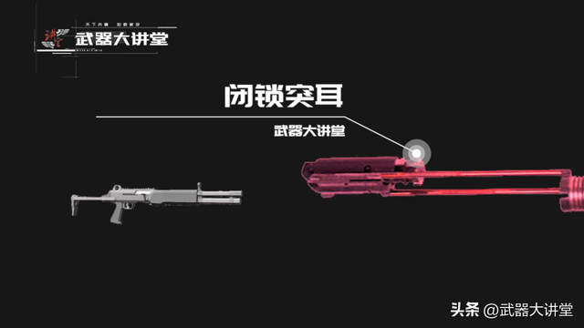 在枪机上设计有两个大型闭锁突耳,这样设计一方面是因为霰弹的口径装药量都比较大,更大的尺寸能带来更好的枪机强度,但是也比较方便加工生产。