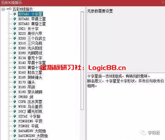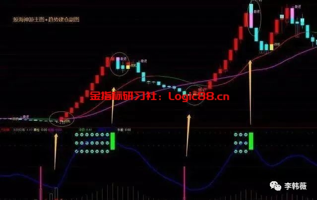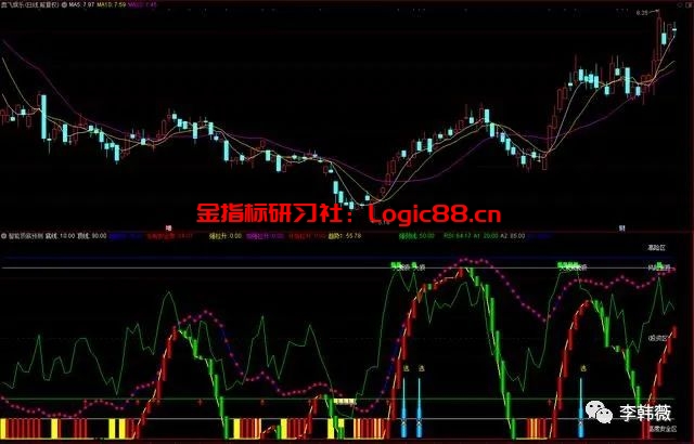 编写好五彩公式后,可以叠加到K线上面,会把特殊的K线形态用不同颜色标识出来。