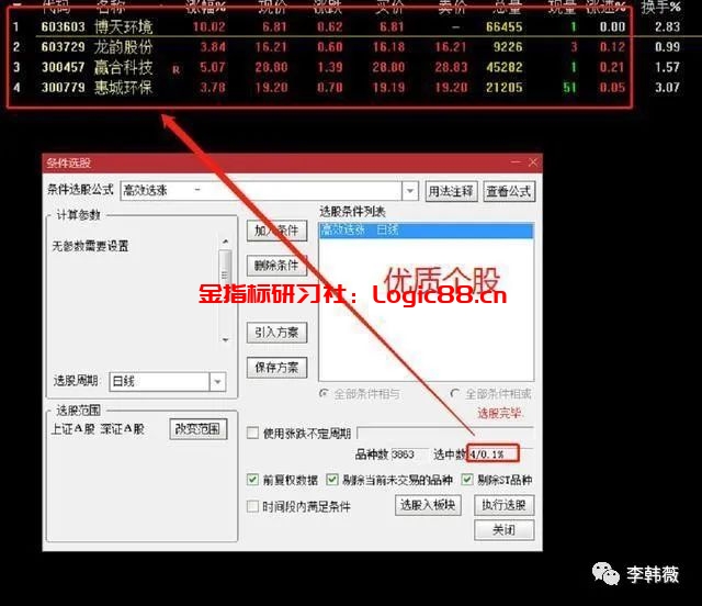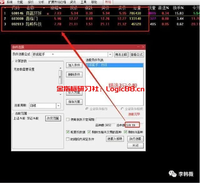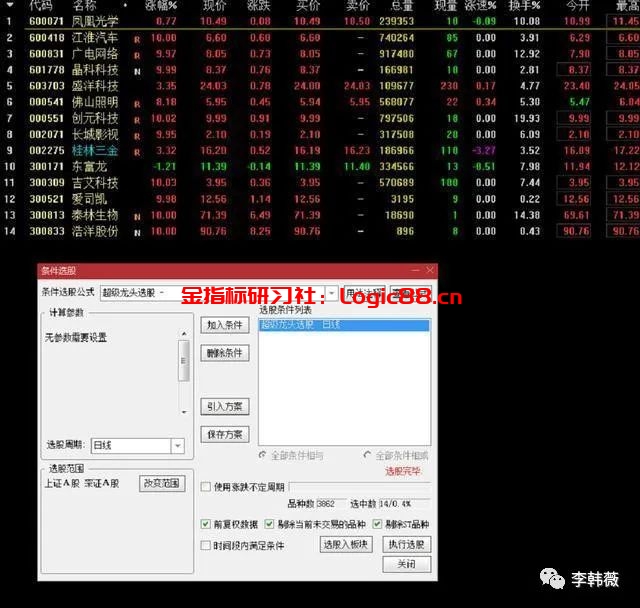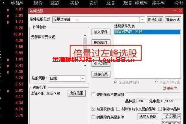 想要从三千多只票中选择适合自己的票如同大海捞针,那么,我们可以利用条件选股公式把符合一定技术形态的票快速的挑选出来。(下图是使用倍量过左峰选股器选出的符合要求的票)