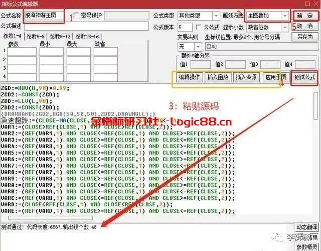 在指标公式编辑区,可以通过引用指标公式,在原有的指标基础上进行修改,也可以通过插入函数等实现对指标公式的编写。具体的指标测试步骤再上图中都有标注出来,测试通过后,即可在调出指标公式使用。(下图为大家展示编辑出来的指标公式,主副图指标在“画线方法”中自由选择)。