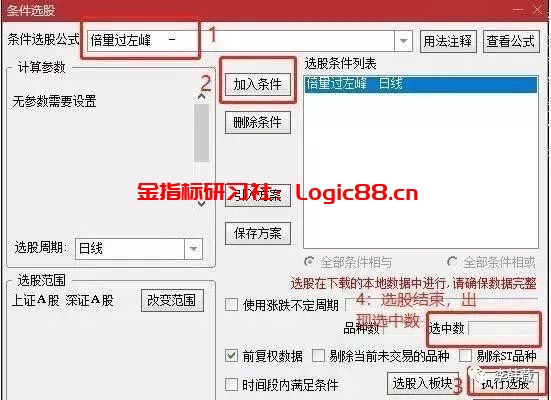 2:编辑完选股公式之后,通过 功能 —— 选股器 —— 条件选股,调用编辑的选股公式。