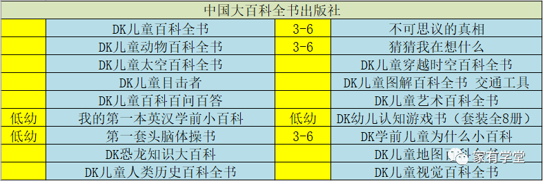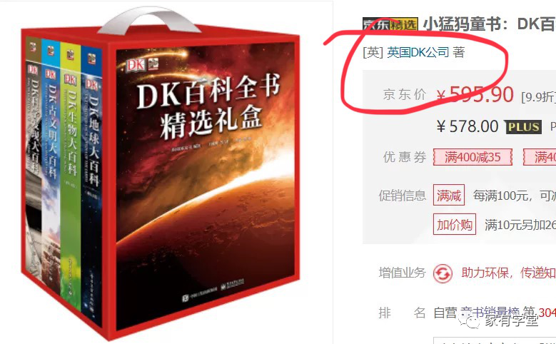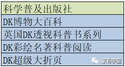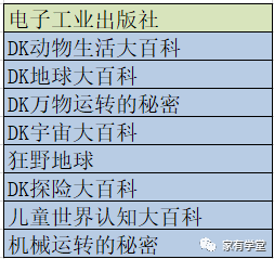 咱们童书群里的宝妈们经常说,带下面这个图标的书可以闭眼买。 DK是Dorling Kindersley的缩写,一家久负盛名的出版社,地位相当于出版界的BBC。DK的评价那么高主要是因为它的信息量丰富,外加真实、有冲击力的图片。 元宝2岁多时我就趁着电商搞活动买了很多DK百科回家,我们一起翻着看了看,元宝很喜欢,这种真实的图片和绘本里的画完全不一样,包罗万象,对于孩子来说非常有冲击力。 小时候看图片,大一些时加上文字讲,平时看绘本时,碰到一些知识点会随时抱出DK来查查,不知不觉中,很多DK都已经被翻了无数遍。 曾经有一段时间,我打算收齐DK,可是买着买着就发现,这个想法基本实现不了,买的速度跟不上它新出版的速度。 我把家里的DK整理了一下,发现和DK合作的出版社有12家之多,很多家长也对这一点发出质疑,经常问, 到底买哪个出版社的? 趁着清明假期我研究了一下,觉得这样回答最合适: 1 并没有哪个出版社是禁区,每个出版社的装订、纸张、印刷、内容都过关。统计了一下我家的DK,我比较喜欢的几本也并不都是同一个出版社的,大百科、电子工业、科学普及社等都有,大百科、电子工业两个大社出的百科类书多一些,另外的出版社各有特点,像是国开童媒,就是主打趣味性DK,总之各有千秋。 2 碰上电商特价,3折以下时,带着DK标的都可以闭眼入。 3 如果从几本内容差不多的书里挑, 首选“英国DK”、“美国DK”出品,这种没写具体作者的,属于出版社组织编写的旗舰产品,内容有保证,肯定不会踩雷。 4 我想强调一点,DK系列,特别是一些热门的,请务必从 当当、京东自营,或天猫出版社旗舰店购买,DK系列盗版的特别多,正版的大促时价格基本也都在5折以下,有些时候3折就能收! 5 现在是读书月,京东dk经常有活动,可以留意。 下图中是各出版社比较经典、热门的DK系列。 中国大百科全书出版社出版的DK系列最多,书大部分都很厚,开本也大,百科系列偏多。 《DK儿童百科全书》,这本和下面3本都是一个系列,这个系列的图多、大,文字相对少一些。 《DK儿童动物百科全书》 《DK儿童百科百问百答》 这本书是提出一个问题,然后从各个方面进行解释,非常有拓展性。 《DK儿童太空百科全书》 《DK儿童目击者》系列。 这套科普书是一套 分级科普读物,每一个级别都是按孩子年龄划分精选适合的配图及文字,分预备级、1级、3级3套,最符合当下孩子的认知能力,循序渐进不断扩展地带领孩子认识整个世界。 《第一套头脑体操书》 锻炼认知,观察的,适合1-3岁。 《我的第一本英汉学前小百科》 英语启蒙亲子阅读时可以用,大一些有一定基础进入初章前可以再刷一遍,增加词汇量。 电子工业出版社的几本百科系列相对来说图少,字多,内容丰富一些。 《DK动物生活大百科》 《DK地球大百科》 这本书是目击者系列的精华版,从目击者系列里选了海洋、火山、天文、晶体宝石、自然灾害,集结而成精华版。 《DK万物运转的秘密》 科普金奖得主大卫麦考利经典科普绘本,这本充满创意的物理世界入门书让看似毫不相关的事物之间有了联系。 《狂野地球》 喷涌的火山,怒吼的海啸,剧烈的地震,肆虐的飓风…讲述地球各种狂野的力量。 《儿童世界认知大百科》 这套书侧重用数据说话,喜欢数字的会很着迷。 中信出版社 《DK小科学馆》(套装共11册) 这套书不是很难,4岁左右就可以看,图文并茂、通俗易懂。像是编程就是从从身边可见的旗语、手语、象形字开始讲编程的历史,到介绍计算机和程序以及编程的敌人病毒漏洞。后面再引入当下无处不在的App和孩子们喜欢的游戏等等。 科学普及出版社,去年火遍全网的《DK博物大百科》就是这个出版社出版的,科学普及出版社出过的书都比较有特点,追求创新。 《英国DK透视科普书》系列 比较早的一套书了,现在部分单册已经没有货了,很有特点,中间会穿插一些透明的卡片,上面画着动物骨架、血管流向等,可后面的彩图页可以搭着看,或重叠到一起看。 《DK彩绘名著科普阅读》 名著的简写本,搭配上各种背景知识,非常DK。 国开童媒,这个公司出的dk系列可玩性非常大。 《DK玩出来的百科,透视人体奇遇》 这本书非常有意思,如果说《我们的身体》是小宝宝的人体玩具书,那这本书很适合4岁多的小朋友。 《DK趣味立体百科: 太空》 这套书有点坑人,打着立体的旗号,其实只有第一页是立体的,内容也比较简单。 《遇见未来,机器人》 封皮凹凸设计,很炫酷,内容简直是机器人百科全书,对了解人工智能有帮助,有一定难度,适合大一些的孩子看。 四川少年儿童出版社《DK儿童百科全书》(精致版) DK系列里开本最小的一本,甚至连目录也很简单,优点是方便携带,方方面面的内容也都有涉及,这本书是我以前买的,当时京东搞活动,不到10元就到手了!现在20以内入手都可以收,随手翻着看看不错,毕竟别的dk拿起来都费劲! (参照物是小米5s手机) 最后给大家分享一些DK内页图参考(原版、中文等都有),如果您是在本篇文章推送24小时内,请按照下面方式领取: 孩子宅在家,大家可以加我微信号 d524652 ,鸡娃路上一起同行。