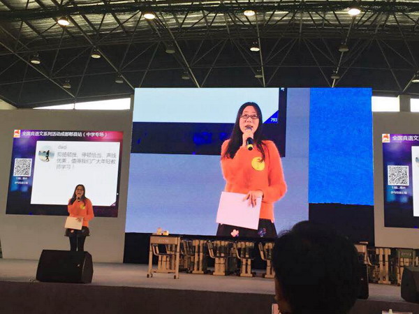 张桂银老师的现场命题作文《艺术,本应高傲地站立》,在短短40分钟的规定时间内,以其独到的视角,缜密的思维和酣畅的笔触,以高出第二名5.33分之多的最好成绩,问鼎桂冠!现场粉笔字手书古诗《登飞来峰》,展示了她力透纸背,潇洒大气的书写风范;名篇《出师表》的朗读,被她诠释得一唱三叹,顿挫悠长;《以“变”为话题》的讲故事,更凸显了她平日扎实的文学功底和理性的思辨能力。在全国西南分赛区的现场评分栏中,能获得三个单项比赛两个总分第一,一个总分第二的惊人战绩,且获奖选手出自同一地区,同一学校,这在此次全国大赛中绝无仅有!