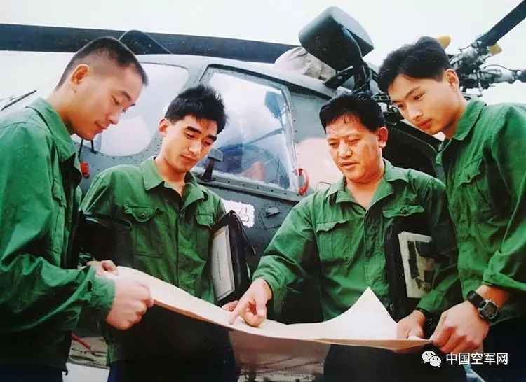 △机长邱光华与机组成员研究救灾飞行航线。