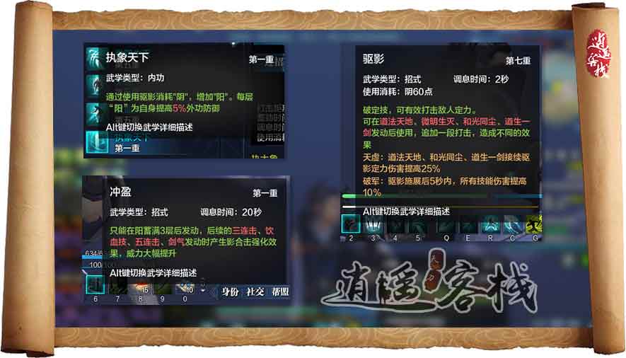 驱影:破定技,在【道法天地】、【和光同尘】、【道生一剑】和【微明生灭】后使用获得不同效果,消耗60点“阴”。真武招牌技能,熟悉不同技能的驱影效果,在战斗中合理使用。经脉强化:PVE选择破军,PVP选择武曲。