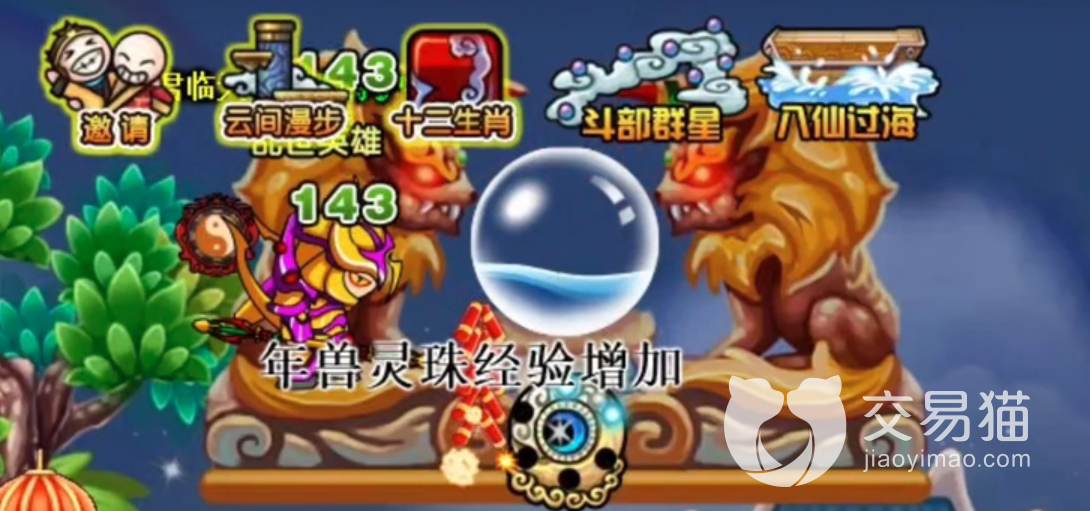 之后跳跃来到上方有两只年兽雕像的平台上,我们可以看到中间有一颗水晶球,在这里鞭炮和烟花可以增加水晶球的经验,鞭炮和烟花都可以使其获得经验值,区别在于烟花增加的更多。