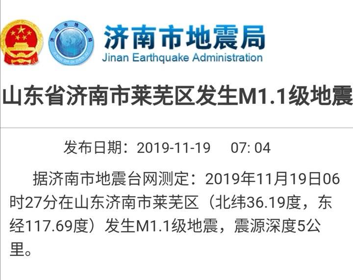 11月19日上午,齐鲁晚报·齐鲁壹点记者从济南市地震局网站了解到,据济南市地震台网测定:2019年11月19日06时27分在山东济南市莱芜区(北纬36.19度,东经117.69度)发生M1.1级地震,震源深度5公里。