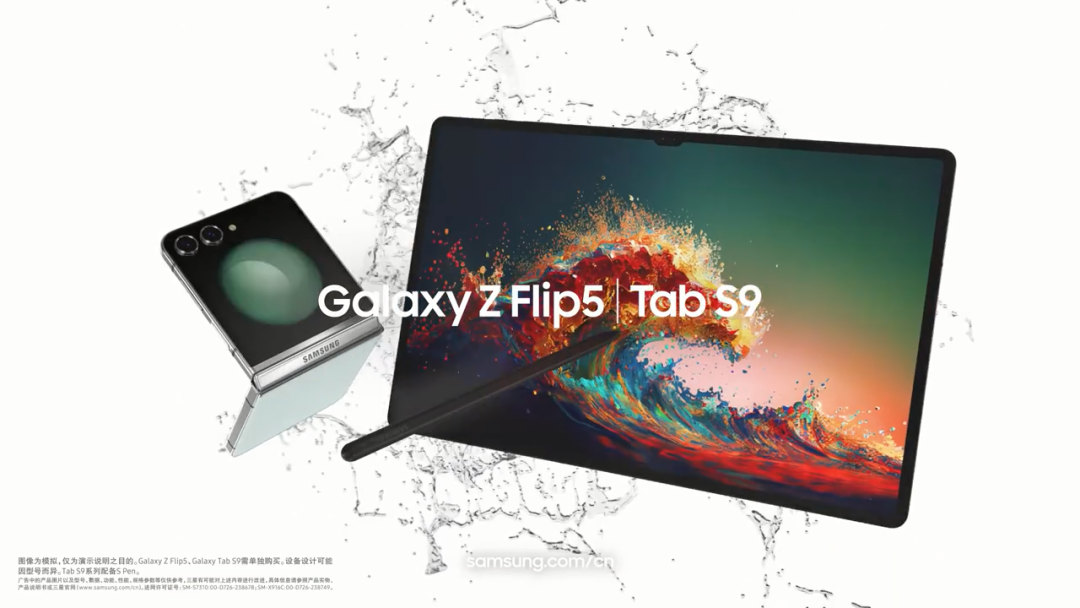 视频中出现的两款新品,“Galaxy Z Flip5”折叠屏手机延续了上一代的防水性,“Galaxy Tab S9”则为三星首款防水防尘的Galaxy Tab S平板电脑。广告相当于预设了一个手机“意外进水”的情境,并对产品进行了“长时间淋雨”的防水性测试,以一种不着痕迹的形式直观地展示出产品的防水性能。