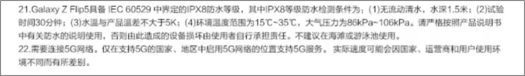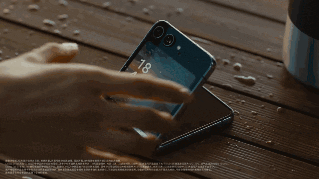 首先是产品的防水性能。视频中出现的这款“Galaxy Z Flip5”折叠屏手机,电商详情页显示为“IPX8级防水”,属于目前国际认证最高的防水等级,可以接受持续浸泡。