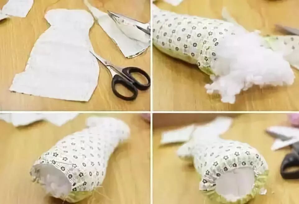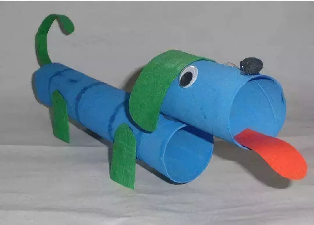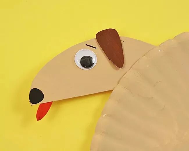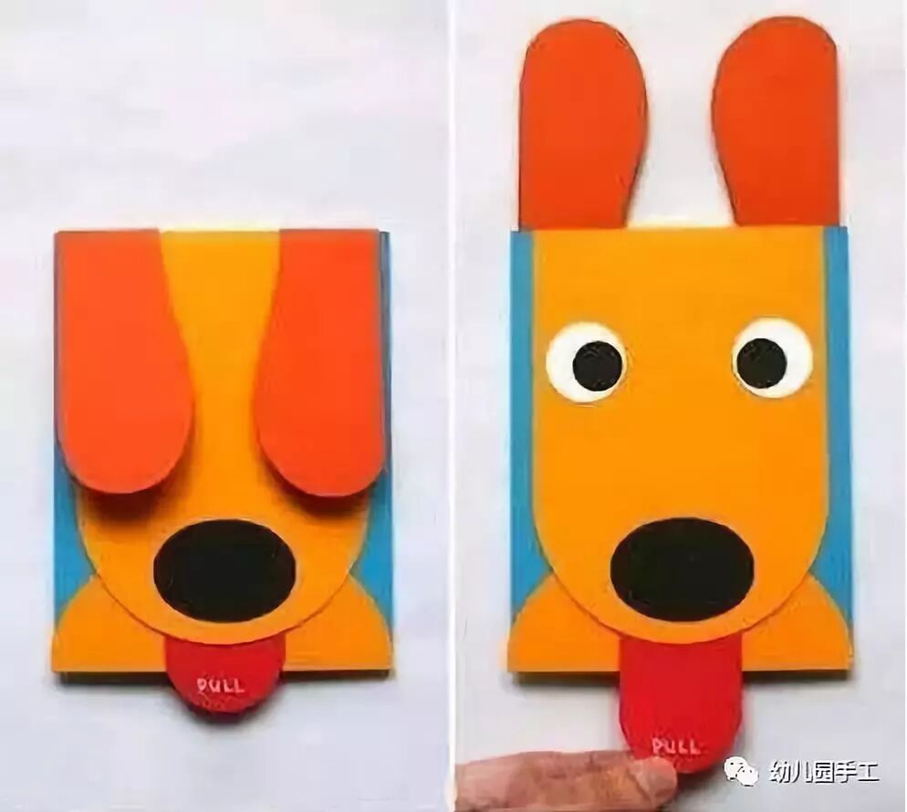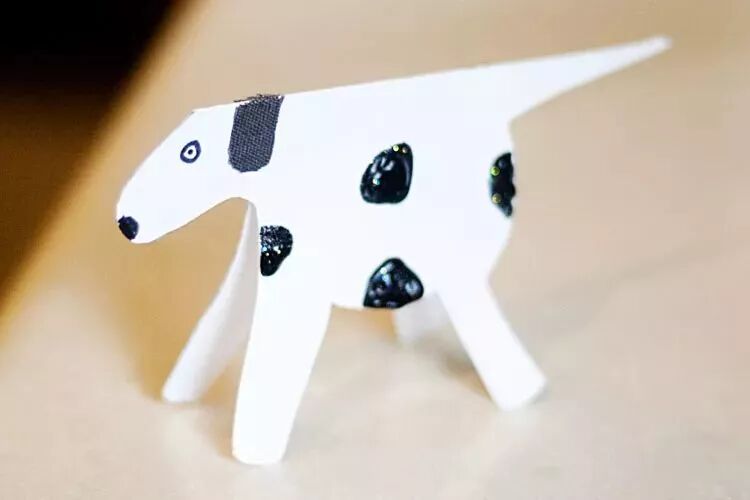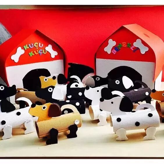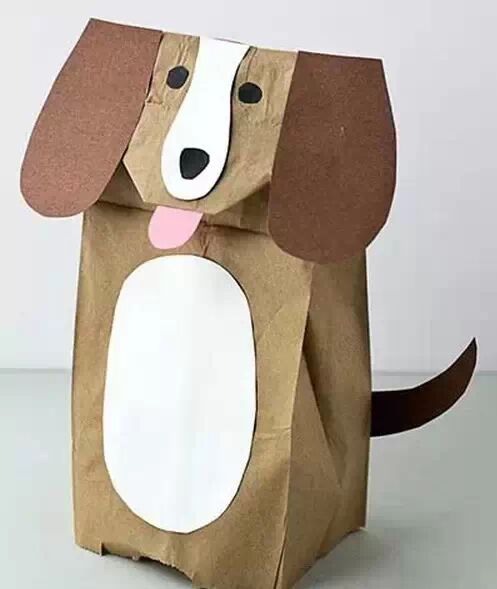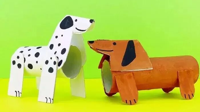 下图的狗狗手工可以直接用卫生纸筒做,也可以将瓦楞纸卷成桶作为身体,以增加肌理感。