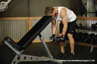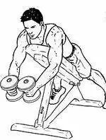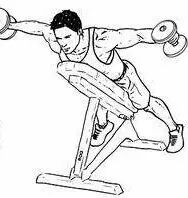 2、调整位置使得上斜凳的顶端刚刚好支撑住你的胸部。在身前将双手伸直,使得双臂跟上斜凳的角度呈垂直线。掌心相对,手肘稍微弯曲。保持手肘的弯曲角度,将哑铃从身侧向后呈弧线拉开。