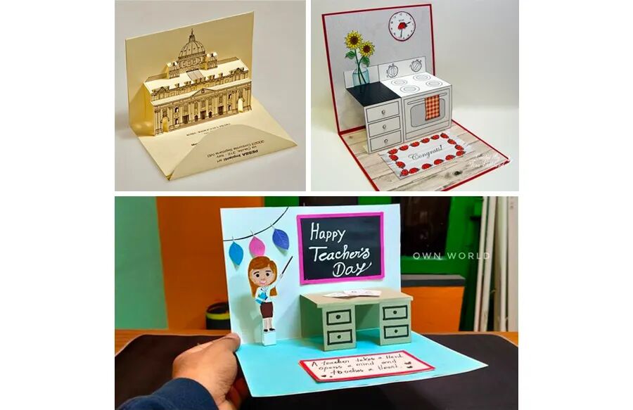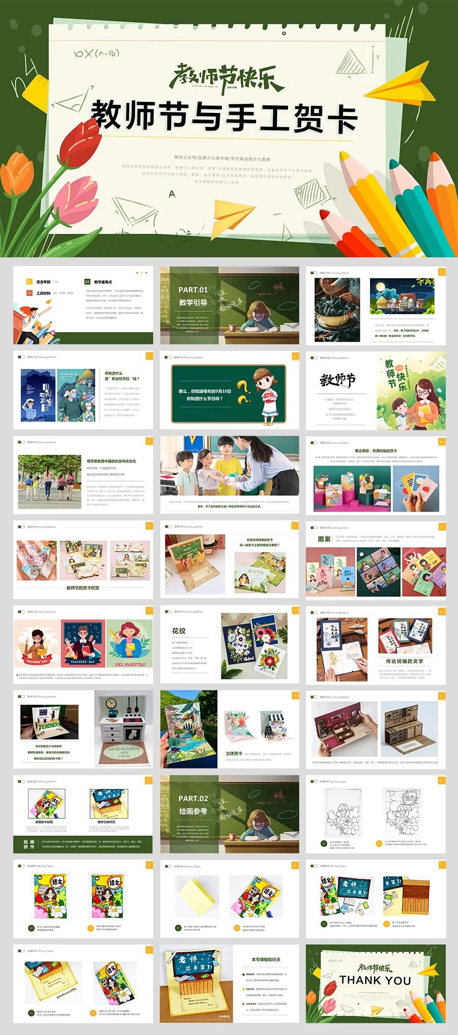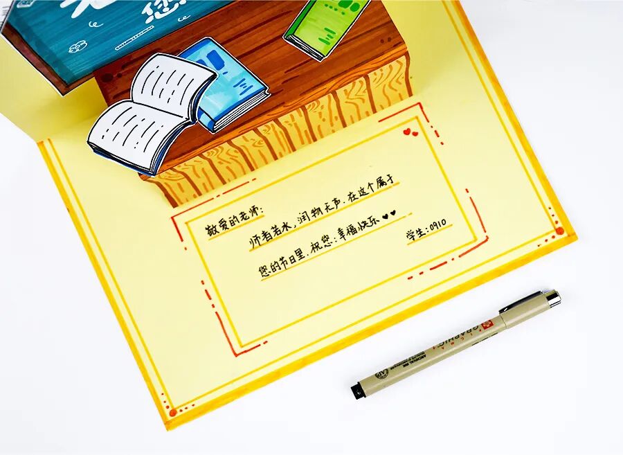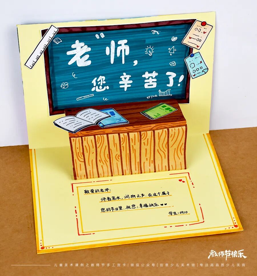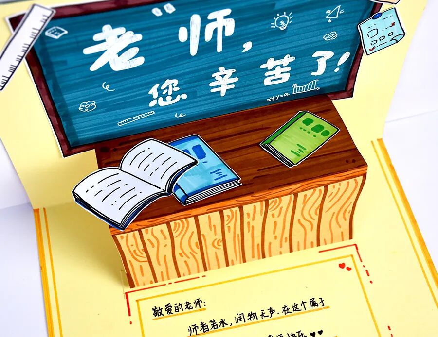 手工绘画 当秋天的脚步渐渐靠近,九月的日历页被轻轻翻开,我们知道一个特别的日子即将到来——教师节。这个节日不仅标志着一个新学期的开始,也是全社会向那些无私奉献、悉心教诲的教师们表达感激和尊重的时刻。 教师节的深远意义:重新审视教育与尊重 教师节让人们重新审视教育的价值,明白无论是在个人成长还是社会进步中,教师都是不可或缺的引导者和支持者。通过这个节日,学生得到了一个表达感恩和尊重的机会,而教师也从中感受到了职业的荣耀和社会的认可。总体而言,教师节弘扬了尊师重道的传统美德,也提醒我们要常怀感恩之心,尊重每一位用知识和爱心点亮我们人生路途的教师。 在教师节这一天,不仅学校会举行各种庆祝活动,许多学生和家长也会送上花束、贺卡或是亲手制作的小礼物,以此表达对教师的感激和敬意。其中,手工制作的贺卡是一种非常特殊和个性化的方式。 贺卡:一张纸的多重情感与祝愿 贺卡是一种用以表达祝愿、感情或信息的卡片式文具。通常由特殊的纸张或卡纸制成,贺卡上常常配有图案、插图或照片,以及用以表达特定意图或情感的文字。贺卡可用于多种场合,比如生日、婚礼、节日和纪念日等,也常用于表达感谢、祝福或慰问。 艺术与创意:贺卡设计的无限可能性 贺卡的设计和制作也是一种艺术表达,通过选择不同的材料、颜色、字体和布局,每一张贺卡都能成为一件独一无二的艺术品。欣赏艺术家们创作的立体贺,你会发现,他们虽然只用到了简单的卡纸,但是通过巧妙地折叠、粘贴、拼接等方式,使贺卡变得立体起来,更加新颖有趣。这样的设计不仅仅是视觉上的享受,更是一种创意和心意的传达。 2.技能目标:教授学生如何设计和制作立体贺卡,包括基本的折叠、剪切、粘贴等手工技能。 3.创造性目标:鼓励学生运用个人的创意和想象力,设计出具有个性和新颖性的贺卡。 1.制作出贺卡的封面:在案例中,巧妙地模仿大家熟悉的课本封面,作为贺卡的封面。当然,小朋友们可以展开自己丰富的想象力,围绕教师节的相关元素,设计富有个性的贺卡封面。 当然,小朋友们完全可以展开自己丰富的想象力,根据自己的喜好和创意来设计封面。在封面上,你们可以绘画一些与教师节有关的元素,比如书本、铅笔、学校建筑或者教师的形象等。此外,也可以加入一些富有意义的文字或口号,如“感谢老师”或“教师节快乐”,以更加直接地表达对教师的感激和祝福,从而完成让人眼前一亮的贺卡封面。 最后,不忘在贺卡内部添加一些文字来表达你的感激和祝愿。可以是简单而直接的“教师节快乐”,也可以是更具个性和情感深度的一段话,用以表达你对老师的尊重、感激和美好的祝愿。这样一来,你的贺卡不仅在视觉上充满吸引力,而且在情感和意义上也将变得无比丰富和独特哦。 你可以展开自己丰富的想象力 在上图示范案例环节中 在设计封面时先画出图案 逐渐丰富和完善色彩与细节 将卡纸沿中间对折 粘贴在对折的卡纸封面上 绘画出黑板、书本、文具等与教师节相关的图案元素 绘画出讲台的平面和立面 分别粘贴在对折卡纸的两面 在讲台的上方可以粘贴上之前创作的书本进行丰富 最后不忘在贺卡内部 看起来就是一本书本的模样 就能惊喜地呈现出藏在贺卡里的内容 点击“阅读原文”获取《教师节的手工贺卡》PPT课件