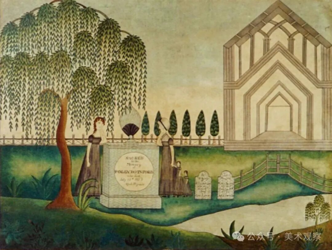 从微观的层面讲,以民间画家爱德华·希克斯(Edward Hicks,1780—1849)的《和平王国》(Peaceable Kingdom)为例,法国艺术家莱热认为他是比法国原始主义艺术家卢梭更重要的艺术家。希克斯画了至少60个版本的《和平王国》,艺术评论家可以说希克斯在重复同一主题时预见到了达达运动。始于1915年的达达运动是对第一次世界大战及其暴行的反映,他们谴责物质主义,并创作他们声称不是艺术的艺术——“反艺术”。达达批判理性、品味和等级、社会秩序和纪律,在想象的表达中理性地控制灵感,但诉诸于武断随意、无意识和原始。〔51〕希克斯对同一主题的重复和变化,一遍又一遍,可以看作是他对主题的消解,对物质主义的评论,因为这些作品早已不是真正的原创作品。所有这些都是达达的元素。希克斯未经学院训练的、稚拙朴素的创作手法及所表达的田园牧歌式的主题,与一个深具怀旧主义和浪漫主义氛围的、公众想象中的前现代美国高度重合,成为与继承欧洲人文传统的学院派艺术分庭抗礼的先锋,〔52〕也成为美国现代艺术叙事逻辑中前置性身份认同的经典来源。