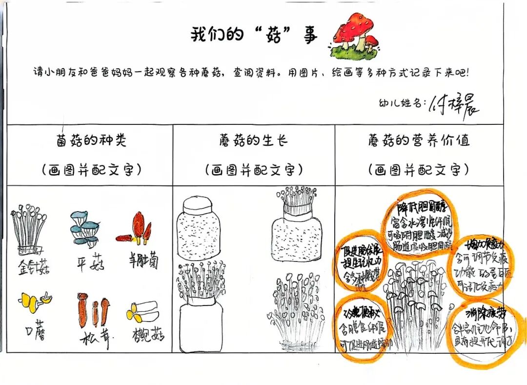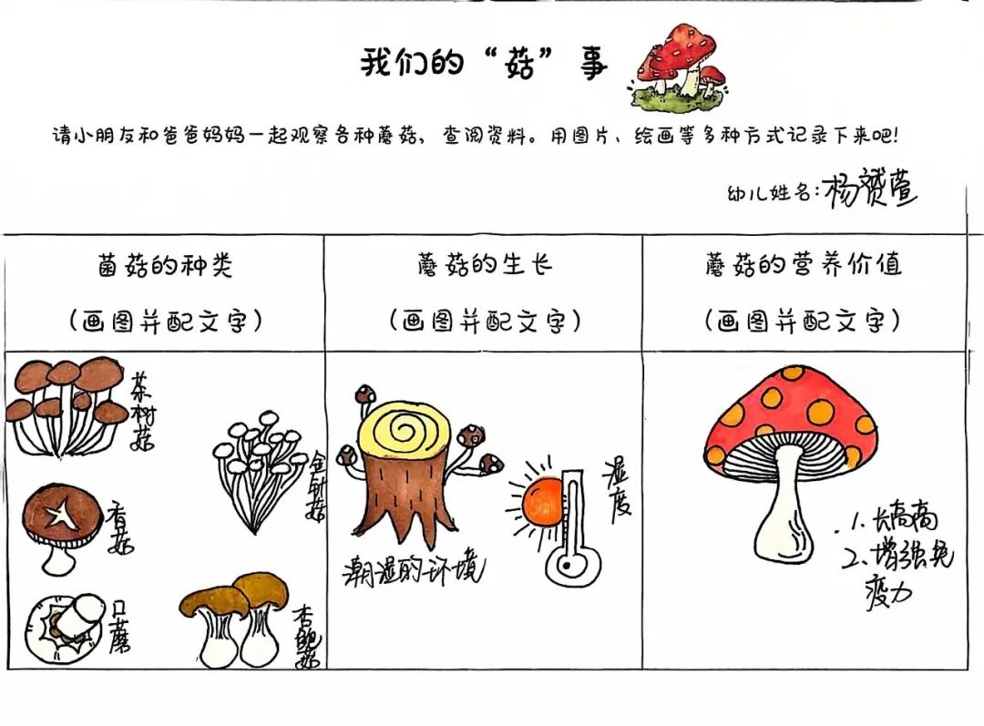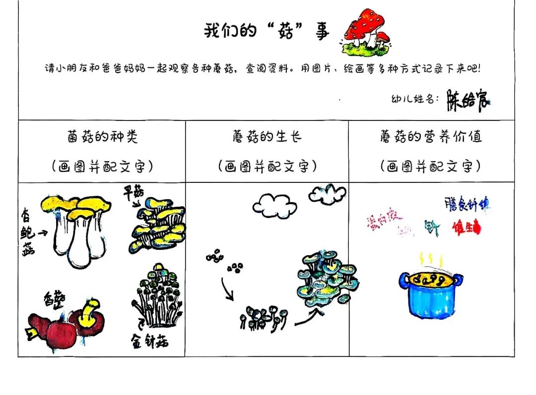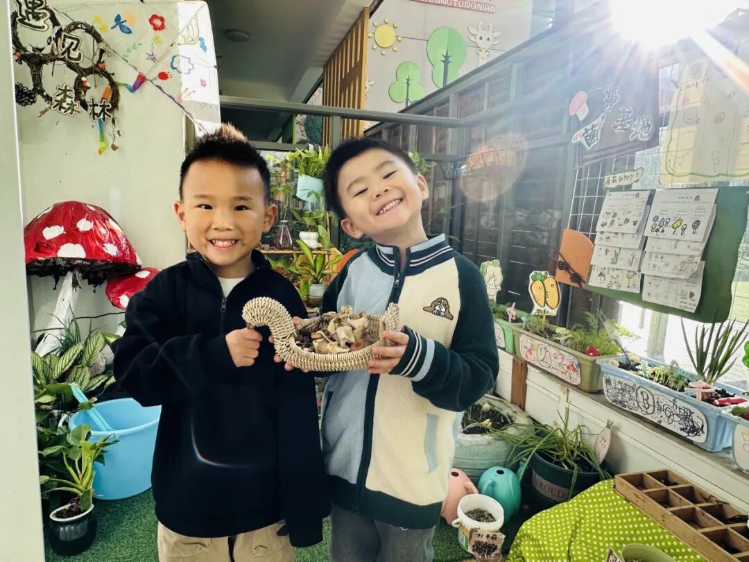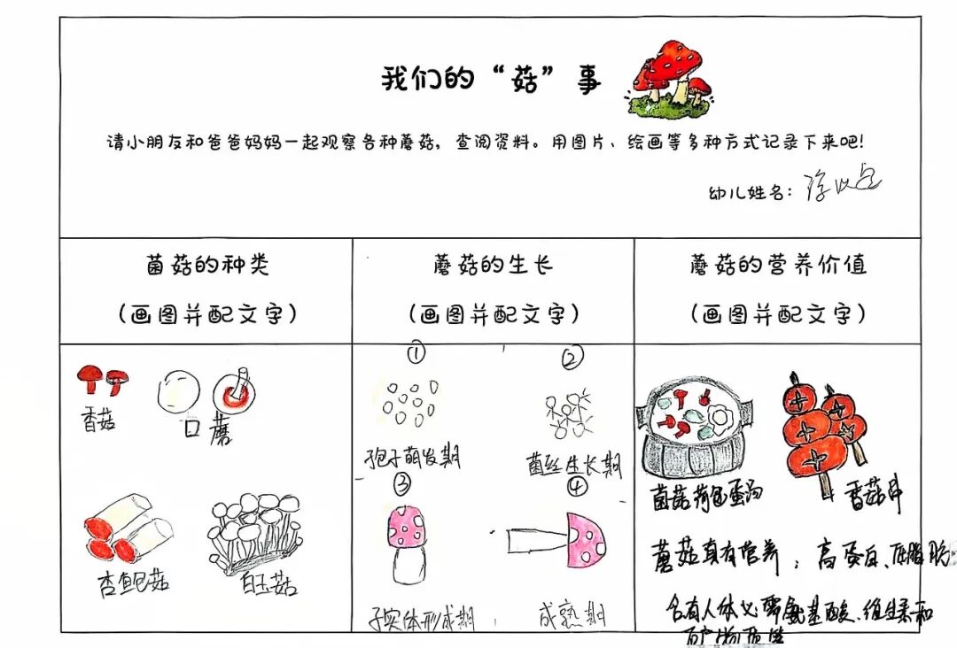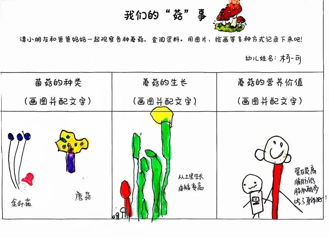 小伞小伞,落在中二 动动小手,撑开小伞。 一次相遇,探秘菌菇! 开启我们的“菇”事~ 1 活动缘起 午餐时间到,今天吃的蘑菇汤引起了小朋友的讨论...... 我好像没有见过蘑菇的种子! 是呀,蘑菇是从哪里长出来的呢,我也不知道? 这个蘑菇和红伞伞,白杆杆一样吗? 不一样,红伞伞是毒蘑菇。 蘑菇都是一样的吗?我们一起来寻找蘑菇的秘密吧! 教师思考 幼儿对蘑菇产生了极大的好奇和兴趣,而蘑菇作为自然生命教育的资源,贴近幼儿生活,对幼儿具有一定的教育价值。于是,我们从幼儿已有经验出发,和幼儿一起建构关于蘑菇的新经验。 2 蘑菇探密记 前期经验调查 我们通过集体活动的方式让孩子们先初步了解蘑菇的种类、生长环境以及营养价值。又采用了亲子互动的方式让家长和孩子们一起调查“认识的蘑菇”、“蘑菇的营养”、“蘑菇生长”在哪里? 在活动开展前,教师向幼儿发放调查问卷并收集问题。从回收的调查表发现,幼儿认识一些常见的食用蘑菇,但是大多数的幼儿都不太了解蘑菇的生长环境。 我们针对于幼儿关于蘑菇的问题,进行了梳理~ 针对幼儿的问题,我们在图书区投放的关于“蘑菇”的绘本,并开展了集体探索的方式了解蘑菇的更多秘密。 答疑解惑 通过进一步的了解,孩子们知道了蘑菇的结构,生长环境,并对毒蘑菇有了一定的了解。 ★ 关于蘑菇 ★ 在本阶段中,幼儿进一步认识了蘑菇,并对蘑菇的生长环境也有了初步的认识。 3 蘑菇种植记 随着课程故事的发展,孩子们对蘑菇的讨论仍然在持续发酵,虽然他们对蘑菇的认知有了很大的提升,但缺少实践,为了能更直观的了解蘑菇的生长,我们决定“种蘑菇”。 / 想把蘑菇种在哪里? / 在种植之前,孩子们探讨了关于“想把蘑菇种在哪里的话题?” 小柠檬:我想把蘑菇种在滑滑梯下面。 妹妹:我想把蘑菇种在小树林里。 闹闹:我想把蘑菇种在灌木丛上。 小圆子:我想把蘑菇种在城堡里。 小朋友们, 这些奇思妙想能实现吗? 不能? 因为要有蘑菇菌包才能长出蘑菇~ / 认领蘑菇菌包 / 国庆假期中,我们在网上购买了一批蘑菇菌包,假期后组织小朋友进行蘑菇菌包的认领。 认领结束后,我们便组织小朋友进行了种植~ 在孩子们悉心照料下,蘑菇一点一点的长大。 渐渐的,孩子们发现蘑菇菌包变得不一样了~ 蘑菇 生病了~ 于是,我们开启了拯救蘑菇的行动 闹闹:我们给蘑菇洗个澡,把绿绿的地方都洗掉。 姜一一:把生病的蘑菇隔离起来,否则可能传染,就像诺如病毒一样。 小花生:直接把坏掉的部分都切掉,跟做手术一样。 妹妹:让它多点水,晒晒太阳,就像我们生病一样。 有期待、有惊喜、有收获、有成长..... 终于在孩子们的治疗下,小蘑菇们冒出了头~ 蘑菇在一天天的长大,孩子们用自己的方式记录者蘑菇的成长。 随着蘑菇的长大, 我们进行了采摘~ / 教师思考 / 《指南》指出:教师应支持幼儿与同伴合作探究与分享交流,引导他们在交流中尝试整理、概括自己探究的成果,体验合作探究和发现的乐趣。如一起思考蘑菇生病的解决办法;幼儿教育只有让教育回归孩子生动有趣的日常生活中去,从教师主引导到还给幼儿自主,让自主活动成为最具吸引力的地方,才会绽放教育的活力。 4 蘑菇创想记 在孩子们好奇心的驱使下 开启了一场菌菇大创想之旅 以绘本为媒介 为孩子推开探索创作之门 让孩子通过自己的智慧和指尖 去感受蘑菇菌的缤纷和趣味 给孩子带来快乐和喜悦 / 设计与合作——蘑菇屋 / / 想象与创造-蘑菇变变变 / 蘑菇采摘以后,进行了晒干处理,怎样展示材更好看了,小朋友变把它融入到自己的画里~ 利用黏土,捏出了属于自己的小蘑菇。 / 教师思考 / 对3-6岁儿童来说,不怕困难、勇于探究、敢于尝试、乐于想象与创造、学会感恩等是幼儿成长至关重要的品质。在班本主题活动中生发区域游戏,幼儿通过游戏获得直接的生活经验和情感满足。在游戏过程中,幼儿的游戏兴趣浓厚,还会适时的对游戏进行创新,服务意识也有所提升,遇到问题时,能与同伴合作共同解决问题,时刻处于游戏的主体地位,体现了较强的观察力、语言表达能力和模仿能力,社会交往能力以及学习品质也得到了增强。 写在最后 一次活动的开展可能会很长很长,就像小蘑菇一样,在细水长流的日子里,默默萌发,积极生长,孩子们的心也跟着一紧一松的,在发现问题、解决问题的同时也逐渐建立起对蘑菇的情感。“小蘑菇”渗透到了孩子们身体的每个细胞,延伸到孩子们生活中的每个角落里,这自然也在孩子们心中烙下了深深的印记。而作为引导者的我们,也是在不断的磕磕碰碰中逐渐摸索、成长,更好的给予孩子成长的方向。 编辑 | 中二班 审核 | 罗曼![]()