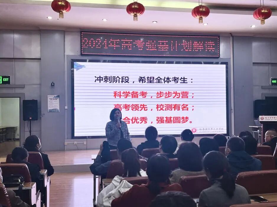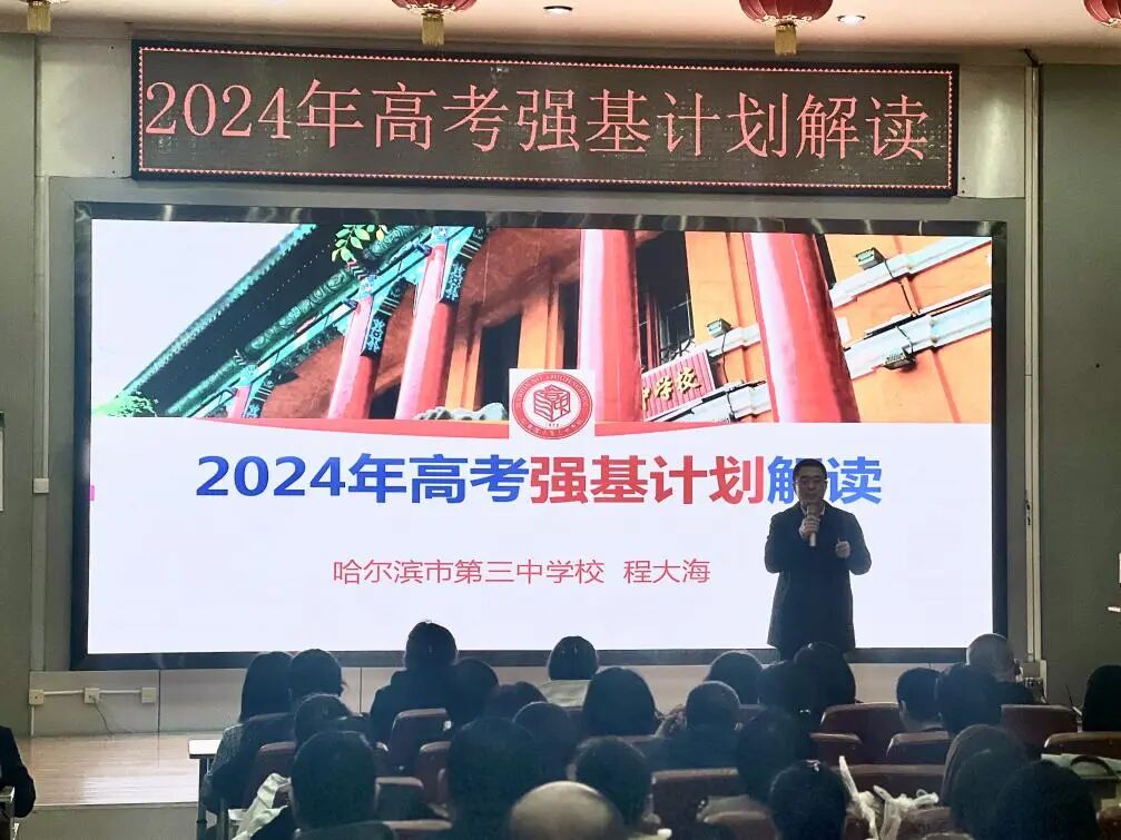 点击蓝字 关注我们 2024年是强基计划实施的第五年。近日,具备强基招生资格的院校开始陆续发布2024年招生简章。强基计划是什么?今年的强基发生了哪些变化?现在该做哪些准备?这些都是广大考生和家长们目前迫切关心的问题。 4月12日,哈三中副校长程大海为高三家长带来了关于2024年高考强基计划的全面解读。本次讲座由学生发展中心主任冯岩主持,高三学年主任张莉、学生发展中心副主任陈雷以及高三班主任老师全程参与。讲座采用线上、线下相结合的方式,吸引了500多位家长收听、收看。 程大海副校长围绕家长最关心的“强基计划是什么?”“强基计划怎么报?”“强基计划怎么选?”三个方面进行了详细介绍,并以往届的录取情况为依据,做了实例解读。 讲座中,程大海副校长建议对于有学科专长和明确学科兴趣的学生加入强基计划,在面对高考时把握主动权和选择权,并具体分析了今年各高校在强基计划中的招生流程、考核标准、时间安排等,为家长和孩子备战高考提出了切实可行的建议。 讲座后,学校领导、老师为家长现场答疑,就有困惑的问题提供了建议和帮助。 供稿|谭菲笛 编辑|石运 审核|冯岩、陈雷