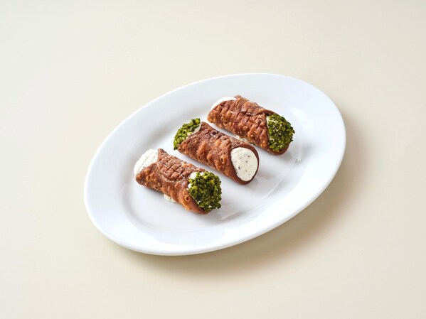 同样,甜点类目里也新增了家庭分享式甜点——西西里奶油煎卷。这道西西里岛的街头小吃据说已有千年历史,因经典电影《教父》而名声大噪,是当地人每逢聚餐派对必备的小吃。将管状的面皮炸至金黄酥脆,冷却后挤入奶油状但颗粒感十足的乳清干酪(Ricotta),配上开心果碎即可上桌享用。