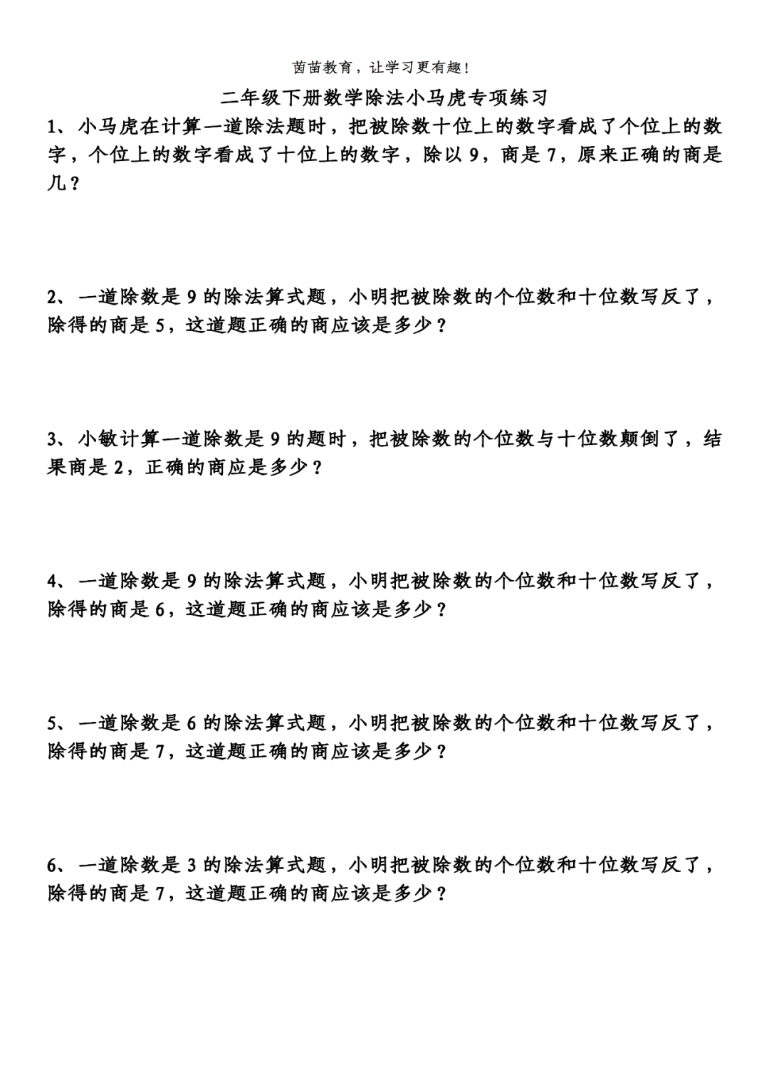 1、小马虎在计算一道除法题时,把被除数十位上的数字看成了个位上的数字,个位上的数字看成了十位上的数字,除以9,商是7,原来正确的商是几??
