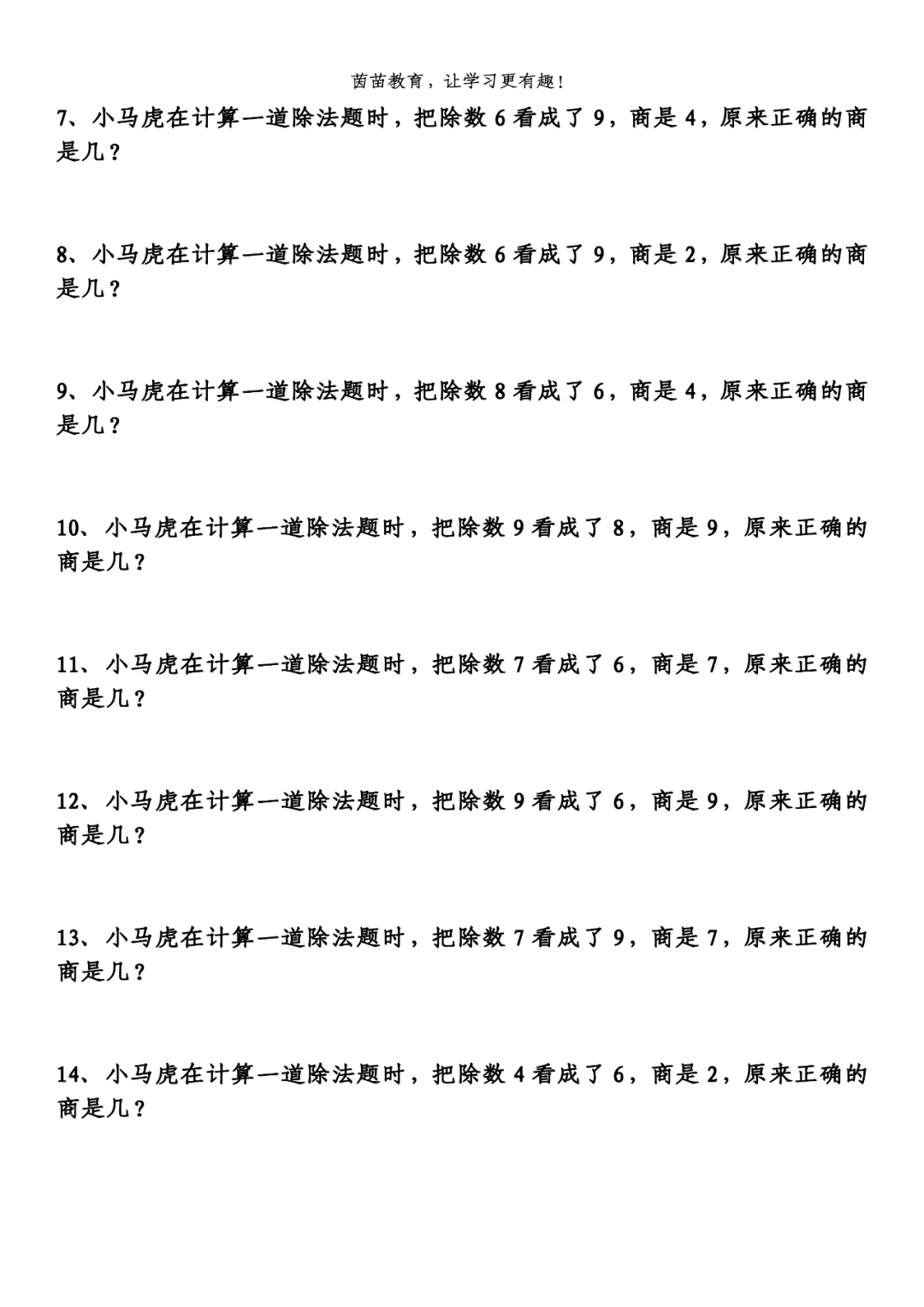 7、小马虎在计算一道除法题时,把除数6看成了9,商是4,原来正确的商是几?
