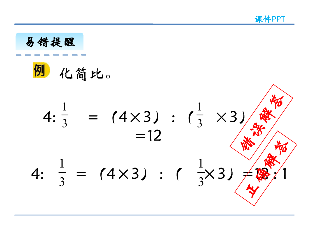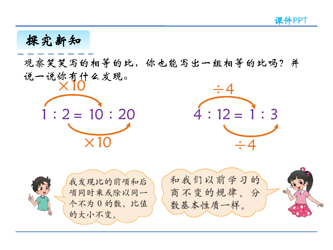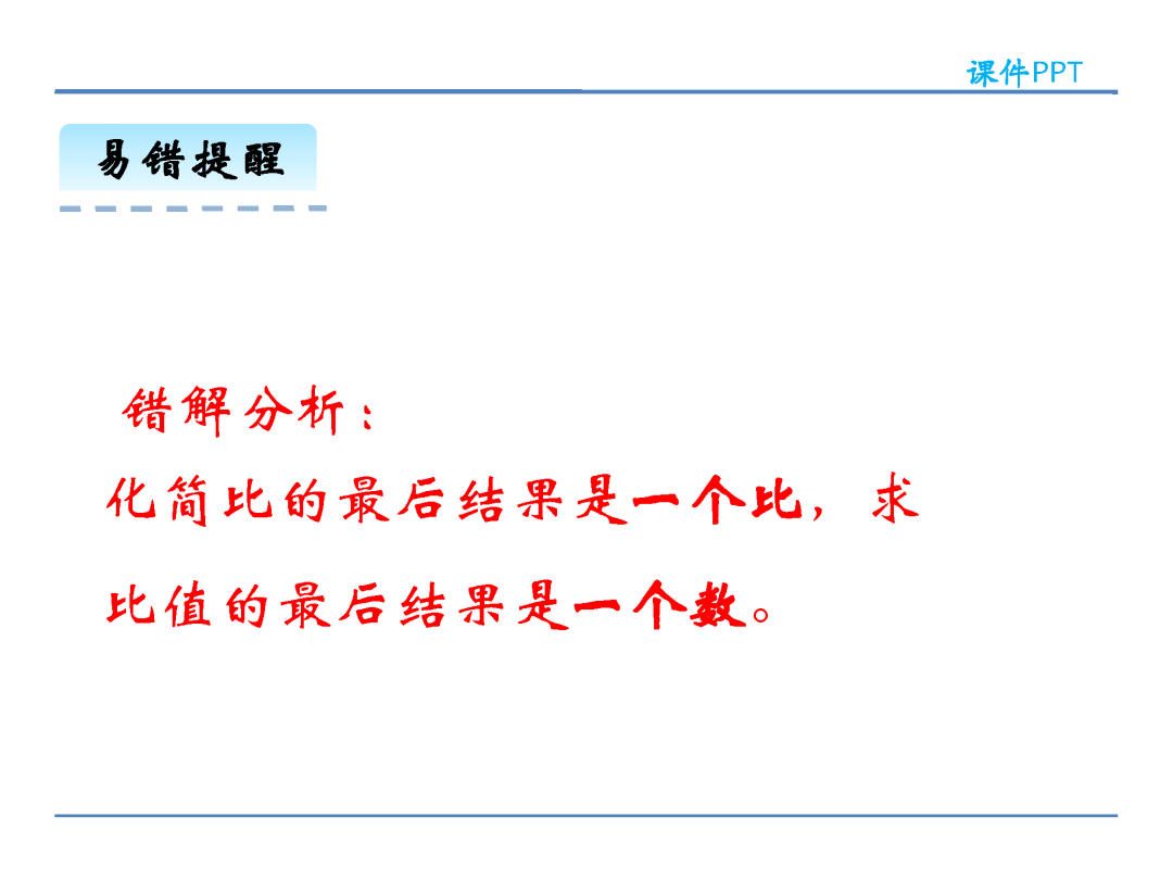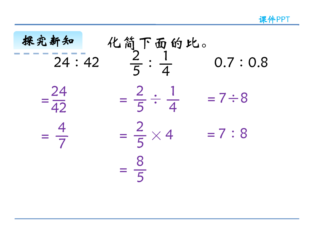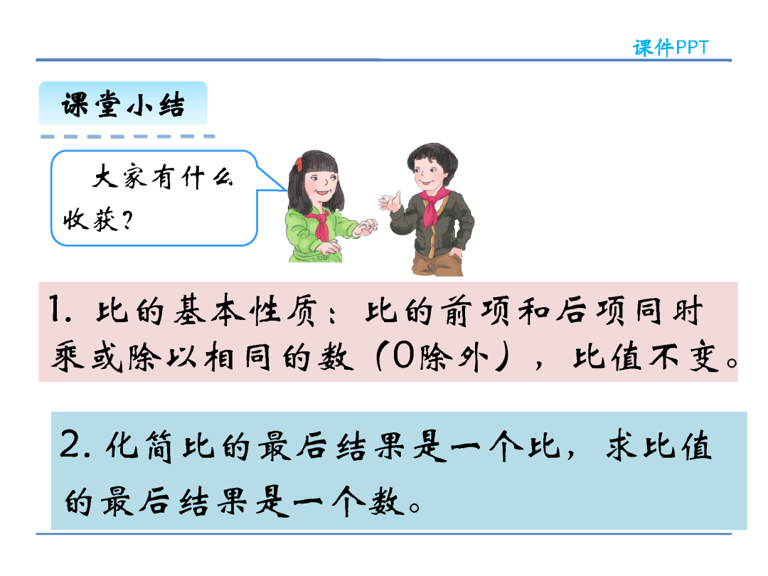 (2)在计算方法上,化简比时可以改写成分数约分化简,也可以改写成除法求商化简,还可以把比的前项和后项同时乘或除以同一个不为0的数;求比值则是用比的前项除以比的后项。