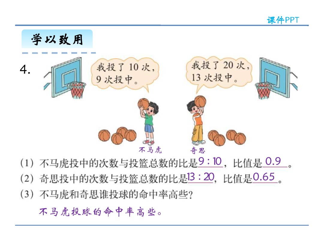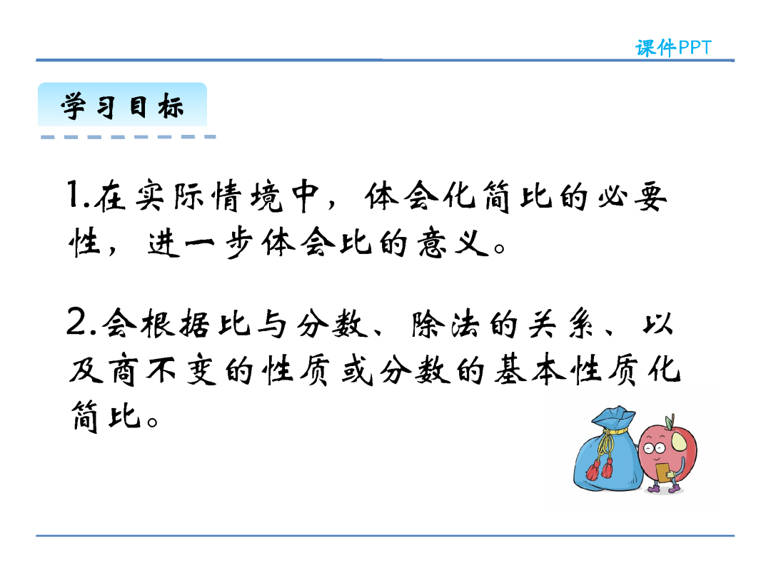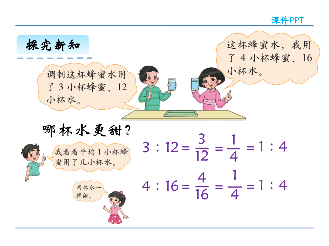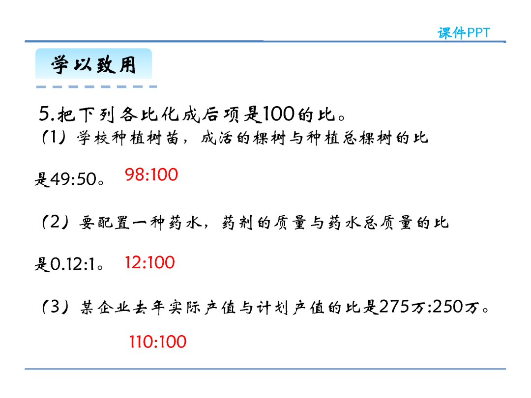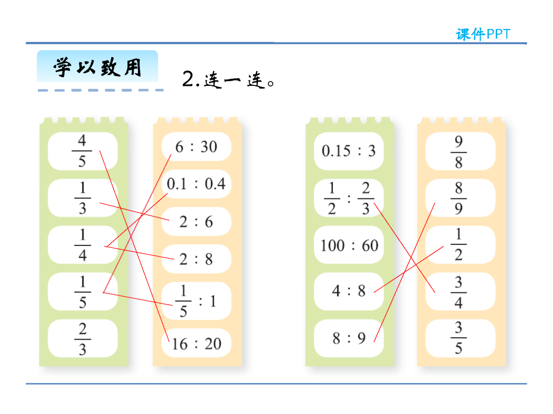 (2)在计算方法上,化简比时可以改写成分数约分化简,也可以改写成除法求商化简,还可以把比的前项和后项同时乘或除以同一个不为0的数;求比值则是用比的前项除以比的后项。