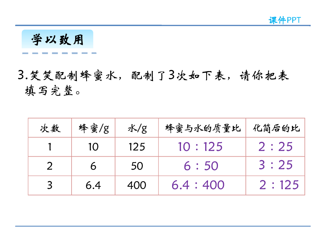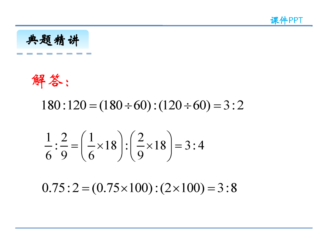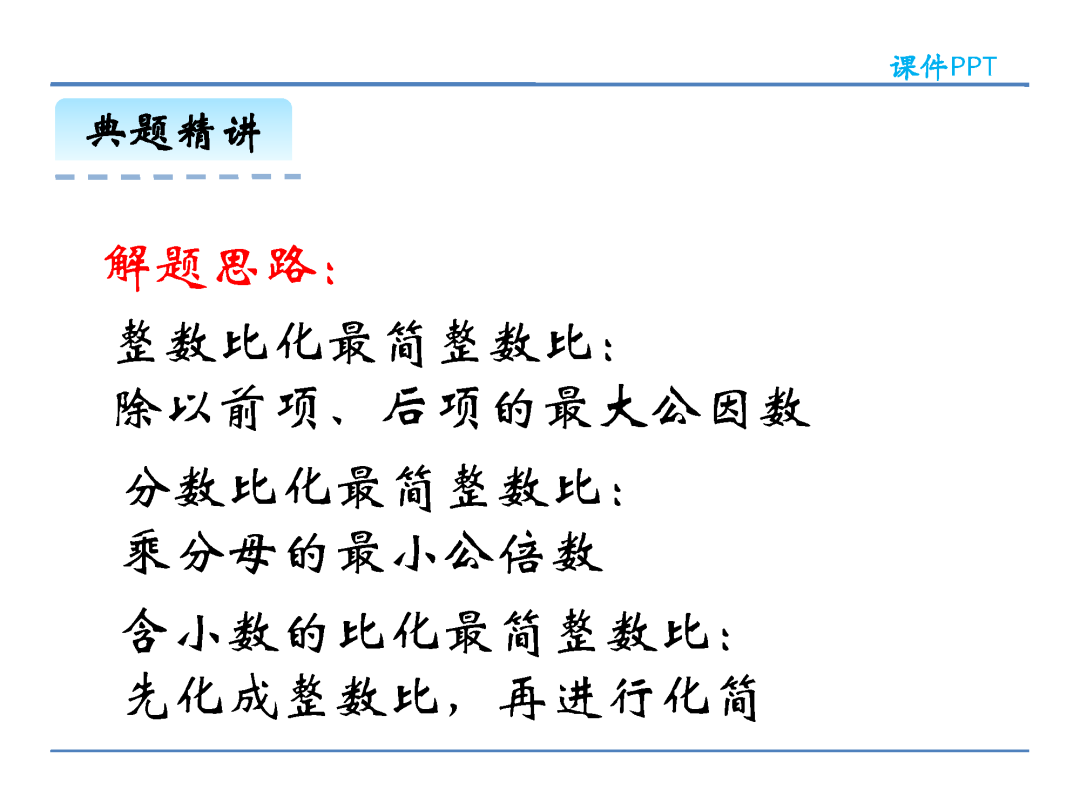 方法三,把比的前项、后项同时除以它们的最大公因数,直接化成最简整数比。