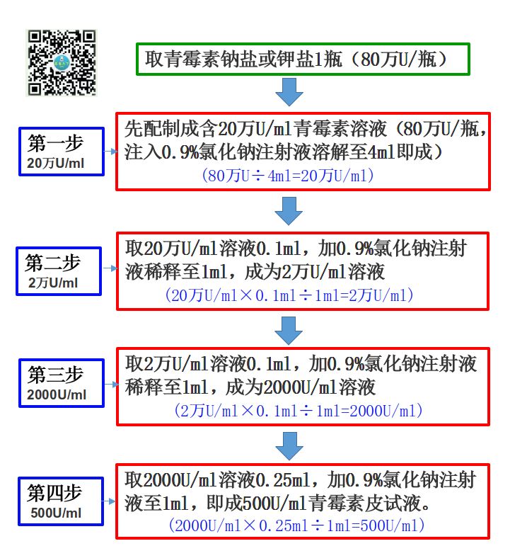 也可用青霉素皮试剂配制,每瓶含青霉素钠2500U。使用该皮试剂仅需一次稀释,可节约操作时间、减少工作量。
