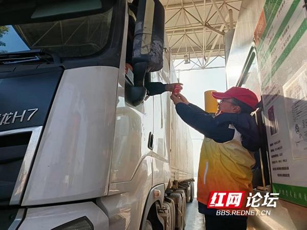 古港收费站工作人员身着志愿服为卡车司机递上物品,传递温暖。