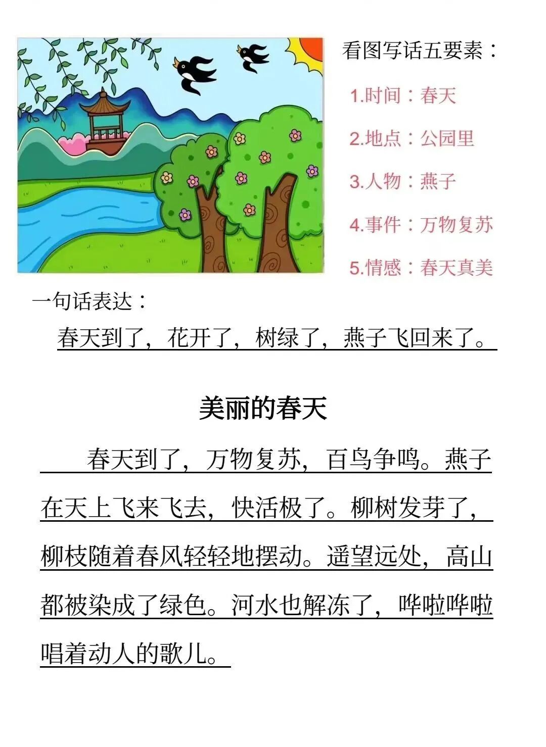 『新学期必备』国家公共教育服务平台小学 ? 初中 ? 全科目教学视频汇总 0、最新发布【语/数/英/道法/音乐/美术/科学】2024春小学教案课件(下)全套 1、|语文 | 数学 | 英语|1-9年级下册同步微课全在这里 2、2024春季(多版本)语文+数学+英语1-6年级下册+上册电子课本(高清版) 3、统编版语文1-6年级下册全册课文预习卡丨可打印 4、统编版语文1--6年级下册全册生字组词| 可打印 5、统编版语文1--6年级(下册)学生用书详解丨附高清电子版 6、【新学期必备】部编版语文1--6年级下册全册生字笔顺动画演示 7、统编版语文1-6年级下册课堂笔记+思维导图,一线名师整理 8、新学期必备丨统编版语文1--6年级下册生字练字帖(带拼音、笔顺、组词) 9、统编小学语文1--6年级下册教师用书电子版(可下载) 10、编版语文一年级下册《默写能手》(含答案)|可下载 11、统编版语文1--6年级(下册)《快乐读书吧》知识点整理,可下载打印! 写话二年级上册12、部编版语文1至6年级(下册)课文内容 中心思想 归纳汇总 更多资料往下翻 更多资料往下翻 【作文素材】描写春天的好词、好句、好段,让孩子的作文更生动! 看图写话空白版 看图写话范文![]()