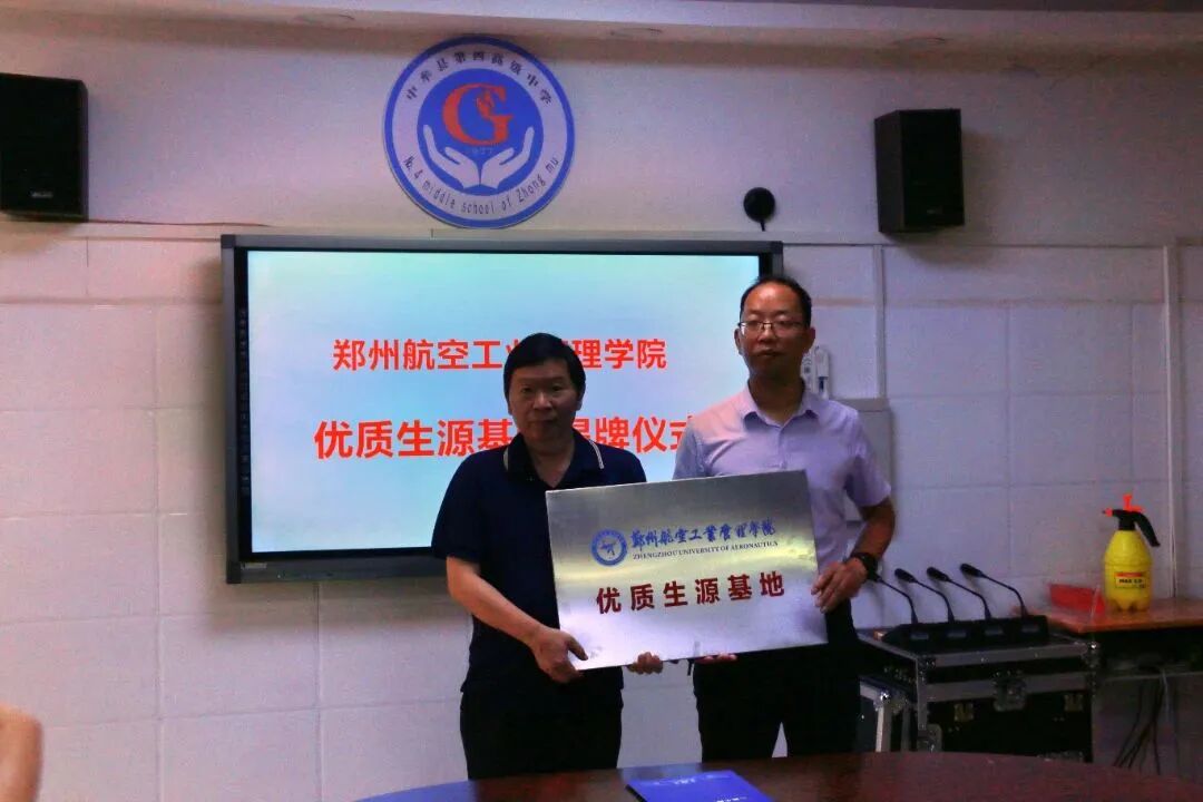 随后,双方共同签订“优质生源基地”协议,并正式启动挂牌仪式。在庄重而又热烈的氛围中,郑州航院商学院的代表为中牟县第四高级中学揭开了“优质生源基地”的挂牌,象征着两校之间紧密的联系和共同发展的决心。