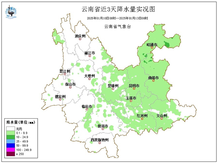 ??????预计未来一周,弱冷空气活动频繁,我省东部地区气温波动明显。1月13日受南支槽影响,怒江州北海拔最高的城市部、迪庆州西部、昭通市东部有阵雨,高海拔山区有阵雪或雨夹雪;1月14日至15日受冷空气影响,东部地区日最高气温下降4~6℃,局地超过8℃,昭通市、曲靖市北部有小雨,高海拔山区有雨夹雪;18日至19日再次受冷空气影响,东部地区日最高气温下降4~6℃,昭通市有零星小雨;其余时段,大部地区晴间多云。中东部、南部夜间至清晨局地有大雾。