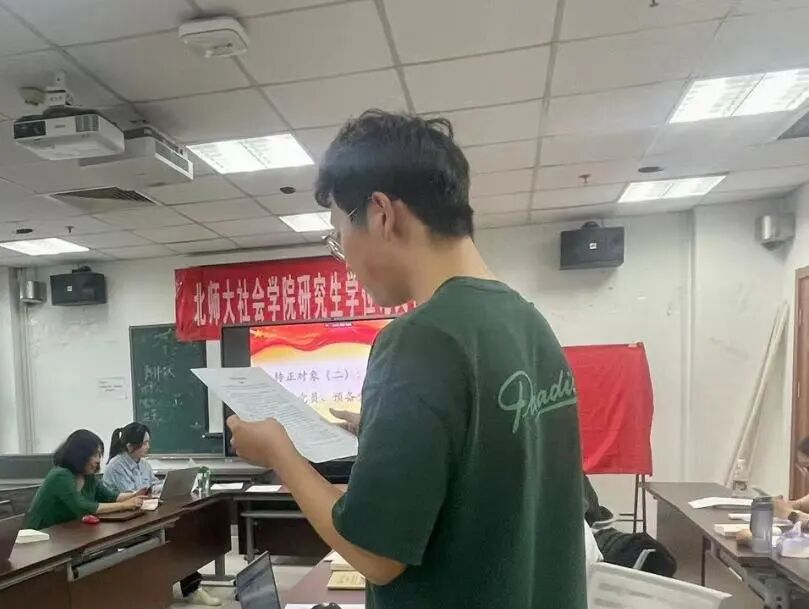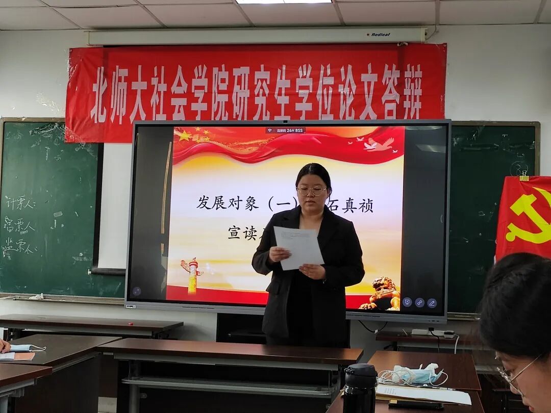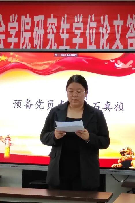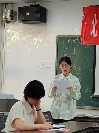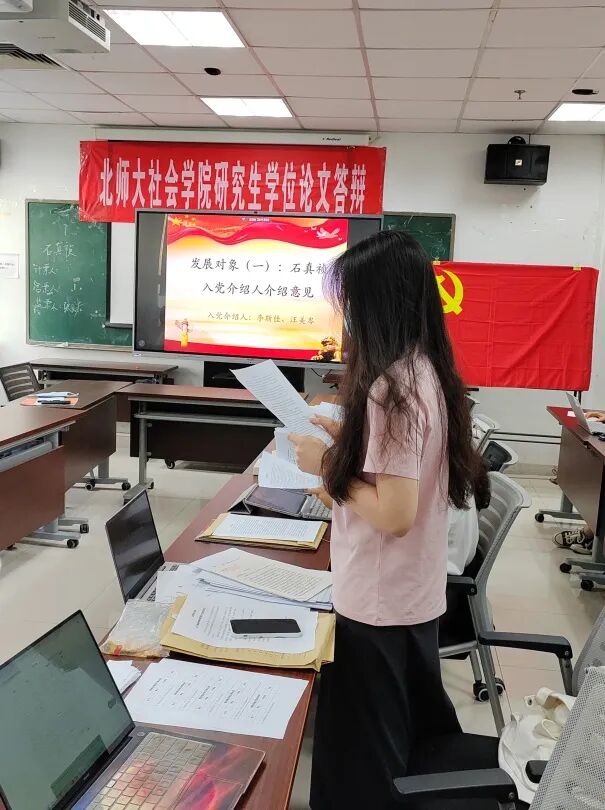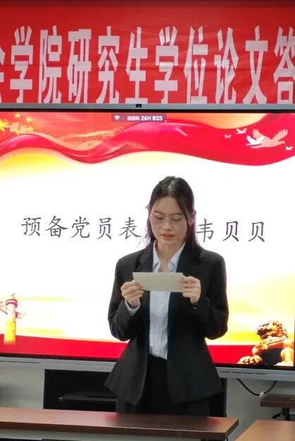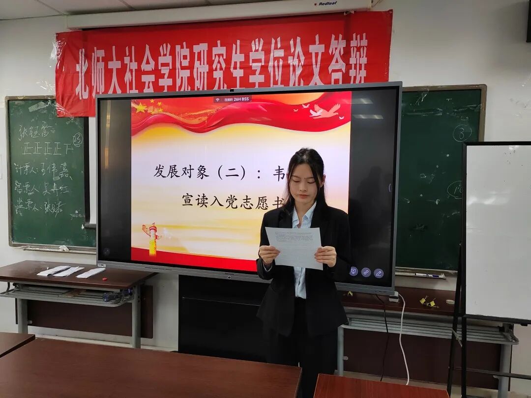 2023年6月13日18时,社会学院本科生党支部召开了2023年第二场预备党员接收大会。本次会议由党支部书记张戈嘉同志主持,大会应到正式党员23名,实到14名,应到预备党员16名,实到11名,符合会议召开的条件。本次会议就是否接收石真祯、韦贝贝、张钰笛三位发展对象为预备党员的问题进行讨论。社会学院党建组织员林秀兰老师出席本次会议。 会议开始,全体起立合唱国际歌,会议在庄严的歌声中拉开序幕。 发展对象:石真祯 第一位发展对象是石真祯同志。首先,该同志宣读《入党志愿书》,陈述了个人的入党动机以及对党的认识,并结合自己的理论学习和社会实践等方面向党组织汇报其思想变化的过程,并表达了加入党组织的迫切愿望与坚定决心。接着,石真祯同志的两位入党介绍人对该同志进行介绍,全面细致得评价了该同志的情况,并希望该同志进一步提升理论素养。 石真祯宣读《入党志愿书》 随后,支部书记张戈嘉同志宣读了石真祯同志的政治审查与支部审议报告,结果表明该同志政治历史清白,家庭及主要社会关系政治历史清楚,无重大历史问题。宣读后,在场的支部同志对石真祯同志的入党资格进行了充分讨论,结合该同志的日常学习与工作,指出该同志的优缺点,并对该同志提出了中肯建议。 入党介绍人意见(右代读) 与会党员讨论 在此环节后,在场正式党员进行了无记名投票,未到场党员提交了书面意见,投票结果为通过。最后,张戈嘉同志宣读支部接收决议,同意接收石真祯同志为预备党员。 发展对象:韦贝贝 第二位发展对象是韦贝贝同志,该同志宣读《入党志愿书》并进行了自我陈述,真实表达了自己的入党动机,生动地讲述了自己对党的认识,从理论学习、参与学生工作等方面全面地介绍了自己的基本情况,深刻进行了自我反思,坚定地表达了自己为共产主义事业奋斗的决心。随后,韦贝贝同志的两位入党介绍人分别就其专业学习、参与社会实践与学生工作和日常生活等方面进行了详细的介绍。 韦贝贝宣读《入党志愿书》 随后,支部书记张戈嘉同志宣读了韦贝贝同志的政治审查与支部审议报告,结果表明该同志政治历史清白,家庭及主要社会关系政治历史清楚,无重大历史问题。接着,在场的支部同志对韦贝贝同志的情况发表了个人的意见,对该同志的优点给予了充分肯定,并为之提出了中肯的建议。 入党介绍人意见(右代读) 与会党员讨论 随后,在场正式党员进行了无记名投票,未到场党员提交了书面意见,投票结果为通过。最后,张戈嘉同志宣读支部接收决议,同意接收韦贝贝同志为预备党员。 发展对象:张钰笛 第三位发展对象是张钰笛同志,首先,该同志宣读《入党志愿书》,陈述了个人的入党动机以及对党的认识,并结合自己的理论学习、参与社会实践、参与志愿服务活动等经历向党组织汇报其思想变化的过程,并表达了加入党组织的迫切愿望与坚定决心。随后,张钰笛同志的两位入党介绍人分别就其专业学习、参与社会实践、田野调查和学生工作等方面进行了详细的介绍。 张钰笛宣读《入党志愿书》 随后,支部书记张戈嘉同志宣读了张钰笛同志的政治审查与支部审议报告,结果表明该同志政治历史清白,家庭及主要社会关系政治历史清楚,无重大历史问题。接着,在场的支部同志对张钰笛同志的情况发表了个人的意见,肯定了该同志的优点,并为之提出了好的建议。 入党介绍人意见 与会党员讨论 在此环节后,在场正式党员进行了无记名投票,未到场的党员向大会提交了书面意见,投票结果为通过。最后,张戈嘉同志宣读支部接收决议,同意接收张钰笛同志为预备党员。 新发展预备党员表态并与林老师合影 接下来,三位新发展的预备党员同志进行了严肃的表态,针对党员们提出的个人不足表达了改进的决心,并表示今后将努力学习理论知识,在实践中不断提高个人的综合素质,并且见贤思齐,以党员标准严格要求自己。 然后,林老师与三位新发展的同志合影留念。 希望新发展的三位预备党员能够不忘初心、牢记使命,不辜负党组织的信任与培养,在预备期的一年中积极表现、刻苦学习、砥砺实践,成为一名优秀的共产党员! 供稿 供图 | 王伟嘉 审校 | 罗文睿 编辑 | 张锦琪![]()