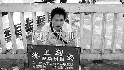 昨天,一名安徽青年男子在新江桥上表演在一米粒上刻字的功夫,引来不少围观者。在几名市民的提议下,这名男子还亮出了绝活,在半个小时内,在一粒米上刻写32个汉字。