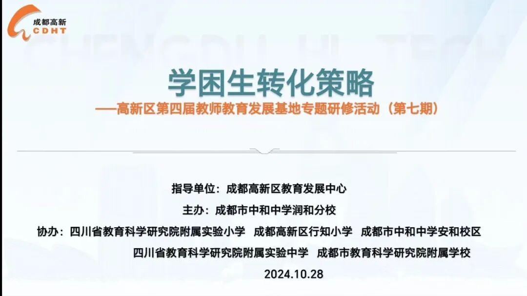 教师发展基地||市教科院副院长李洪兵指导研修 ——成都高新区教师教育发展基地专题研修活动(第七期) 叶落秋深,暖阳和煦,我们与美好相遇,因研修同行。为加强教师发展基地联盟学校的学科教学队伍专业建设,促进教师教学能力的提升和个人专业化成长,10月28日,以“学困生转化策略”为主题的成都高新区教师教育发展基地2024年度第七次研讨交流活动在我校举行。 本次活动特别邀请了成都市教育科学研究院李洪兵副院长、教师发展所黄静梅所长、成都市教育科学研究院教师发展所张学兰副所长、成都市教育科学研究院教研员张丹、成都高新区教育发展中心教师发展部杨丽部长、教研员李文芹、姬锐老师到场观摩指导。中和中学润和分校杨群书记、左强校长,成都高新区第四届教师教育发展基地首席主持人、中和中学润和分校副校长何丽霞及各联席主持人,中和中学教育集团学科行政、教研组长、备课组长、年级组长、近五年新进教师及各共同体学校交流分享教师和学科教师代表参加了本次活动。 成都市中和中学润和分校杨群书记致欢迎辞,并为我们此次学困生转化策略的专题研究研修活动指明了方向,让大家都深刻认识到学困生转化工作对于教育教学质量提升的重要意义。 成都高新区第四届教师教育发展基地首席主持人、四川成都中和中学润和分校副校长何丽霞就《基于真实问题解决的教师教育研修实践》的做阶段性工作总结。从注重顶层设计,制定三年建设规划“建模子”,坚持问题导向,开展现实需求调研“照镜子”,进行系统构建,设计三年基地课程“开方子”,研讨形式多样,开展重点问题研究“找路子”,科研成果显著,形成问题解决方案“迈步子”对教师基地建设工作提出了更高的期望。 课堂是教育教学的主阵地,如何提升学困生课堂参与度,是每位老师都需要深入思考的问题。活动现场,成都市中和中学润和分校查燕老师、四川省教科院附属中学邱敏老师、成都市教育科学研究院附属学校姚秉良老师、省教科院附属小学崇和分校汤钰老师、成都高新区行知小学宋燕娜老师就这一问题展开了精彩的研讨交流。 左右滑动,查看更多 学困生转化一直是老师们教育教学工作中的一大难题,如何巧施对策,令学不再困,学而则优,五所基地校的老师各有策略。 四川省教科院附属中学李婕妤围绕新课标背景下“教学评一体化”中课堂教学评价的育人模式思考作分享。 成都市教育科学研究院附属学校李贤强老师巧用转化策略,力求不让一个孩子掉队。 省教科院附属小学崇和分校施洁老师立足英语学科,分享她的“扶困”小妙招。 成都高新区行知小学李明忆老师多管齐下,努力做到精准施策、多维联动,助力学困生转化。 成都市中和中学润和分校雷莉老师思路新颖,尝试运用新兴教育技术手段,提升学生兴趣,帮助其快速提升。 成都高新区教育发展中心教师发展部杨丽部长对本次活动做了点评,强调了教师基地建设的意义,所研讨的话题要“聚焦小切口,发挥大作用”。 中和中学润和分校左强校长围绕本次活动主题作微讲座,肯定了教师基地建设发挥的作用,希望能以教师基地为中心,辐射更多的老师。 成都市教育科学研究院李洪兵副院长作指导发言。高度肯定了教师基地发展所发挥的巨大作用,强调把教师基地建设成为助推基础教育高质量发展的重要抓手,建议教师基地发展的建构要多样态,建构协同联动教师教育发展机制。 最后,李洪兵、杨丽、黄静梅、左强为本次活动参与分享和研讨的老师颁发了证书。各领导、专家和老师们合影留恋。 在教育的广袤天地里,我们渴望每一朵花的绚烂绽放。今天的活动,我们一起见证了思想火花璀璨的光芒,共同聆听了教育智慧深邃的回响,我们将继续前行在教育的道路上,用我们的热情和智慧,为学困生重新找到学习的乐趣与方向,帮助他们学有所得,学能致用,昂扬向上,茁壮生长。 -END- 文字 | 林全 图片 | 何浩静 排版 | 陈珊珊、熊晓松 一审 | 赵立娟 二审 | 王笑迎 终审 | 何丽霞 往期精选 ??廉洁主题教育||脱颖而出的246名“倡廉小使者”揭榜啦! ??学生队伍建设 || 少年志在国旗下,大队风采领航行 ??共筑梦想之桥--中和中学润和分校九年级中考目标签订仪式隆重举行 ??小一家长开放日 || 同心奔赴 共育花开 ??青年团校||青春向党,团徽闪耀