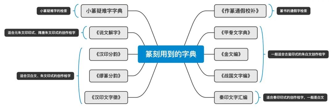 关于字典的使用显然是一个复杂的问题,因为系统学习篆刻必然要接触复杂的古文字系统,这些文字又一般都记录在各种专业字典里,那么,关于字典这个问题,我们今天就系统整理来介绍一下。因为不同的印式要用到不同的文字体系,所以在篆刻需要用到的字典大致如下图: