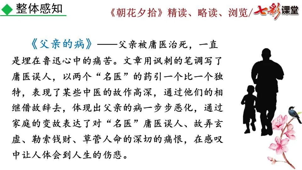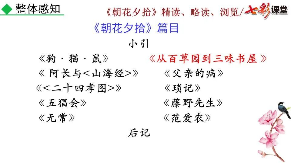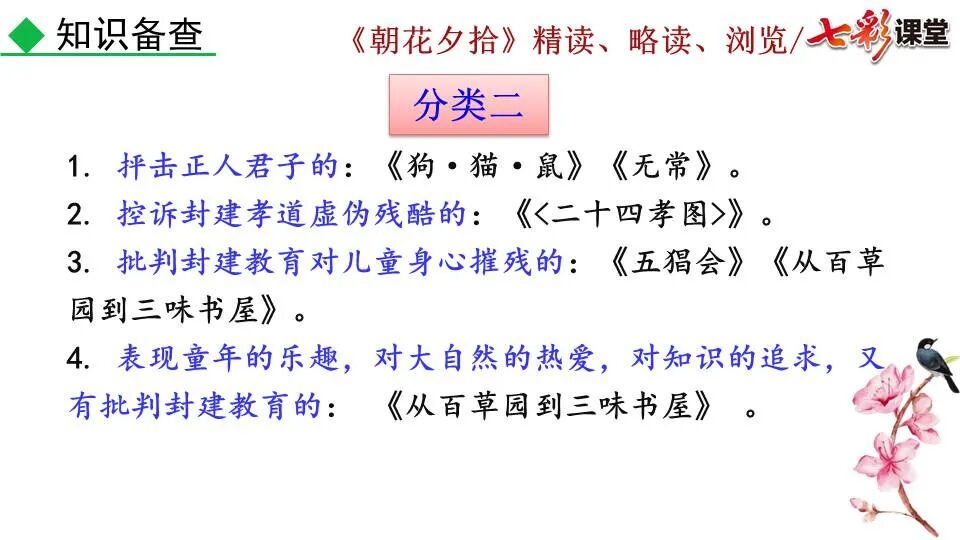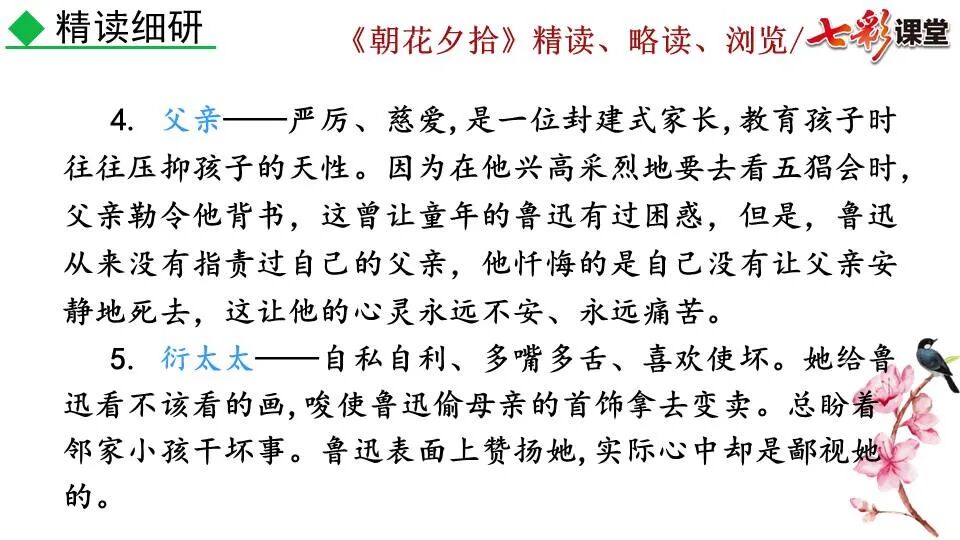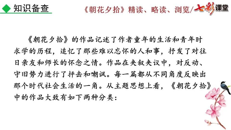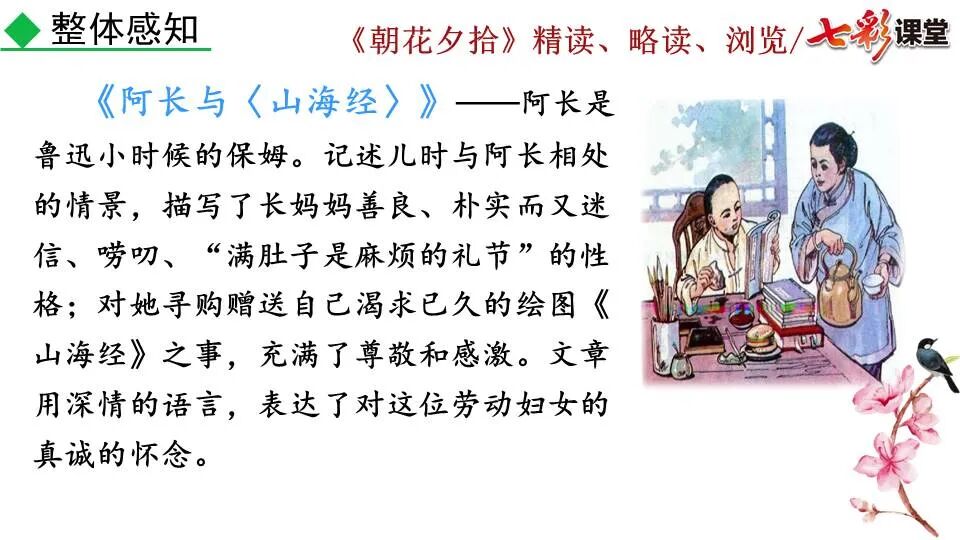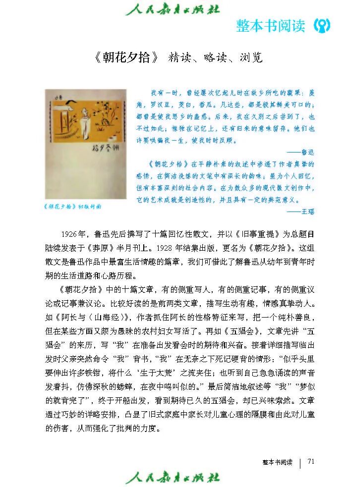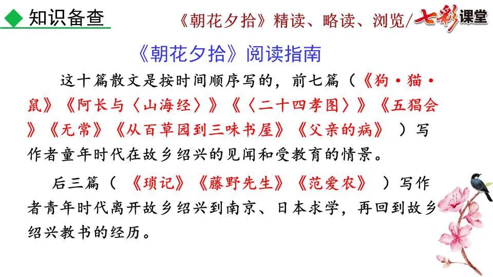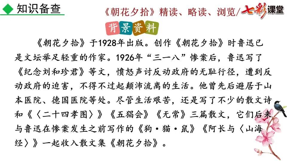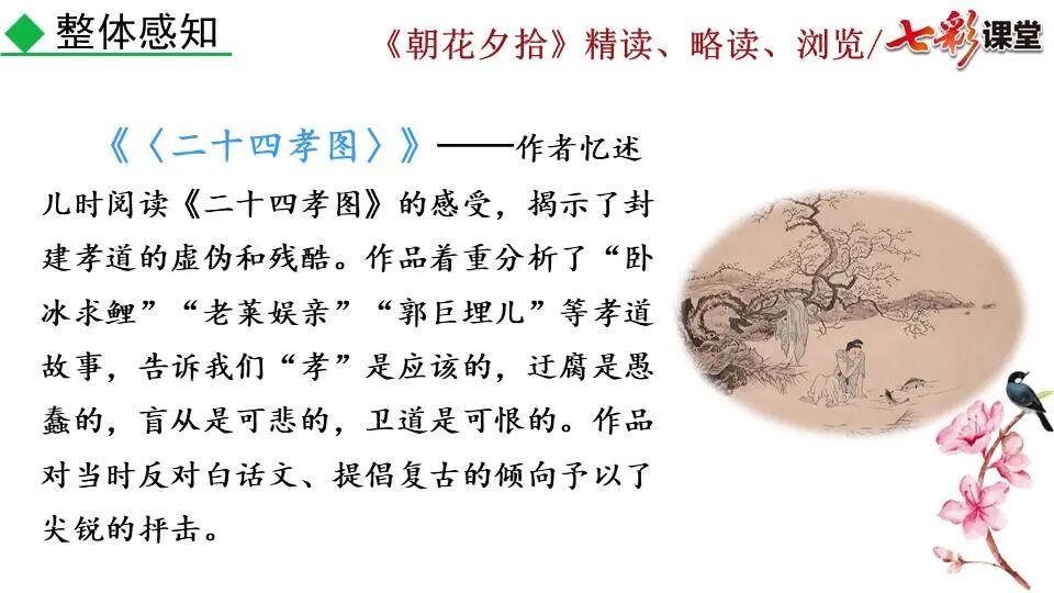 1.《朝花夕拾》是一部回忆性散文集,也是鲁迅惟一一部散文集,写于1926年,最初在《莽草》上发表时名为《旧事重提》。作者是鲁迅,他是我国现代伟大的的无产阶级文学家、思想家、革命家。 2. 在《朝花夕拾》的12篇文章中包括《狗·猫·鼠》,《阿长与<山海经>》、《二十四孝图》、《五猖会》、《无常》、《从百草园到三味书屋》、《父亲的病》、《琐记》、《藤野先生》、《范爱农》 等散文。外加一篇《小引》,一篇《后记》 3. 作者在《朝花夕拾》中全用第 一人称叙事。 二、作品的主要内容 1.《朝花夕拾》是鲁迅回忆童年,少年和青年时期不同生活经历与体验的文字,是记叙文,是回忆性散文。 2.《朝花夕拾》题目意义:“早晨的花晚上拾起”,意即“旧事重提”:“从记忆中抄出来的意思”。是“鲁迅回忆童年、少年和青年时期不同生活的经历与体验”。描绘了清末民初的生活画面。 三、各篇文章的主要内容和主题思想 1.《狗?猫?鼠》——在这篇文章里,鲁迅先生清算猫的罪行: 这篇文章主要通过对猫和鼠的一些秉性,行为的描写来比喻某些人。鲁迅先生在文中阐述他仇猫——即不喜欢猫的原因。其实这些原因与一类人的行为,性格很相像,例如写猫捕食到比自己弱小的动物就尽情玩弄,直到玩厌了,才吃掉,就像某些人,抓住了别人的弱点或不足之处,就想尽办法慢慢地折磨别人,好像如果不折磨够,就不甘心一样,如果别人犯了什么错,受到批评,说不定那种人就会在某个角落里偷偷地奸笑。 2.《阿长与〈山海经〉》——阿长是鲁迅小时候的保姆。记述儿时与阿长相处的情景,描写了长妈妈善良、朴实而又迷信、唠叨、“满肚子是麻烦的礼节”的性格;对她寻购赠送自己渴求已久的绘图《山海经》之情,充满了尊敬和感激。文章用深情的语言,表达了对这位劳动妇女的真诚的怀念。 3.《二十四孝图》——所谓《二十四孝图》主要目的是宣扬封建的孝道。鲁迅先生从自己小时阅读《二十四孝图》的感受入手,最反感“老莱娱亲”和“郭巨埋儿”,最不可思议的是“卧冰求鲤”,形象地揭露了封建孝道的虚伪和残酷。指斥这类封建孝道不顾儿童的性命,将“肉麻当作有趣”,“以不情为伦纪,诬蔑了古人,教坏了后人”。 老莱娱亲:老莱子,春秋时期楚国隐士,为躲避世乱,自耕于蒙山南麓。他孝顺父母,尽拣美味供奉双亲,70岁尚不言老,常穿着五色彩衣,手持拨浪鼓如小孩子般戏耍,以博父母开怀。一次为双亲送水,进屋时跌了一跤,他怕父母伤心,索性躺在地上学小孩子哭,二老大笑。 郭巨埋儿:郭巨,晋代隆虑(今河南林县)人,一说河内温县(今河南温县西南)人,原本家道殷实。父亲死后,他把家产分作两份,给了两个弟弟,自己独取母亲供养,对母极孝。后家境逐渐贫困,妻子生一男孩,郭巨担心,养这个孩子,必然影响供养母亲,遂和妻子商议:“儿子可以再有,母亲死了不能复活,不如埋掉儿子,节省些粮食供养母亲。”当他们挖坑时,在地下二尺处忽见一坛黄金,上书“天赐郭巨,官不得取,民不得夺”。夫妻得到黄金,回家孝敬母亲,并得以兼养孩子。 哭竹生笋:在三国时,有一个孝子,姓孟,名宗,字恭武,从小就丧了父亲,家里十分贫寒,母子俩相依为命。长大后,母亲年纪老迈,体弱多病。不管母亲想吃什么,他都想方设法满足她。一天,母亲病重,想吃竹笋煮羹,但这时正是冬天,冰天雪地,风雪交加,哪来竹笋呢?他无可奈何,想不出什么好的办法,就跑到竹林抱竹痛哭。哭了半天,只觉得全身发热,风吹过来也是热的。他睁眼一看,四周的冰雪都融化了,草木也由枯转青了,再仔细瞧瞧,周围长出了许多竹笋。他的孝心感动了天地。他把竹笋让母亲吃了,母亲的病就好了。有诗颂曰:泪滴朔风寒,萧萧竹数竿;须臾冬笋出,天意招平安。 子路负米:仲由,字子路、季路,春秋时期鲁国人,孔子的得意弟子,性格直率勇敢,十分孝顺。早年家中贫穷,自己常常采野菜做饭食,却从百里之外负米回家侍奉双亲。父母死后,他做了大官,奉命到楚国去,随从的车马有百乘之众,所积的粮食有万钟之多。坐在垒叠的锦褥上,吃着丰盛的筵席,他常常怀念双亲,慨叹说:“即使我想吃野菜,为父母亲去负米,哪里能够再得呢?”孔子赞扬说:“你侍奉父母,可以说是生时尽力,死后思念哪! 黄香扇枕:黄香,东汉江夏安陆人,九岁丧母,事父极孝。酷夏时为父亲扇凉枕席;寒冬时用身体为父亲温暖被褥。少年时即博通经典,文采飞扬,京师广泛流传“天下无双,江夏黄童”。安帝(107-125年)时任魏郡(今属河北)太守,魏郡遭受水灾,黄香尽其所有赈济灾民。著有《九宫赋》、《天子冠颂》等。 陆绩怀桔:陆绩,三国时期吴国吴县华亭(今上海市松江)人,科学家。六岁时,随父亲陆康到九江谒见袁术,袁术拿出橘子招待,陆绩往怀里藏了两个橘子。临行时,橘子滚落地上,袁术嘲笑道:“陆郎来我家作客,走的时候还要怀藏主人的橘子吗?”陆绩回答说:“母亲喜欢吃橘子,我想拿回去送给母亲尝尝。”袁术见他小小年纪就懂得孝顺母亲,十分惊奇。陆绩成年后,博学多识,通晓天文、历算,曾作《浑天图》,注《易经》,撰写《太玄经注》。 卧冰求鲤:晋朝时期,有个叫王祥的人,心地善良。他幼年时失去了母亲。后来继母朱氏对他不慈爱,时常在他父亲面前说三道四,搬弄是非。他父亲对他也逐渐冷淡。王祥的继母喜欢吃鲤鱼。有一年冬天,天气很冷,冰